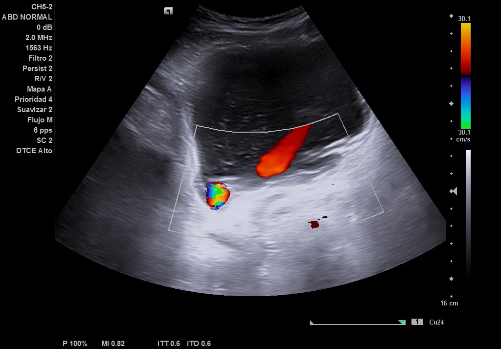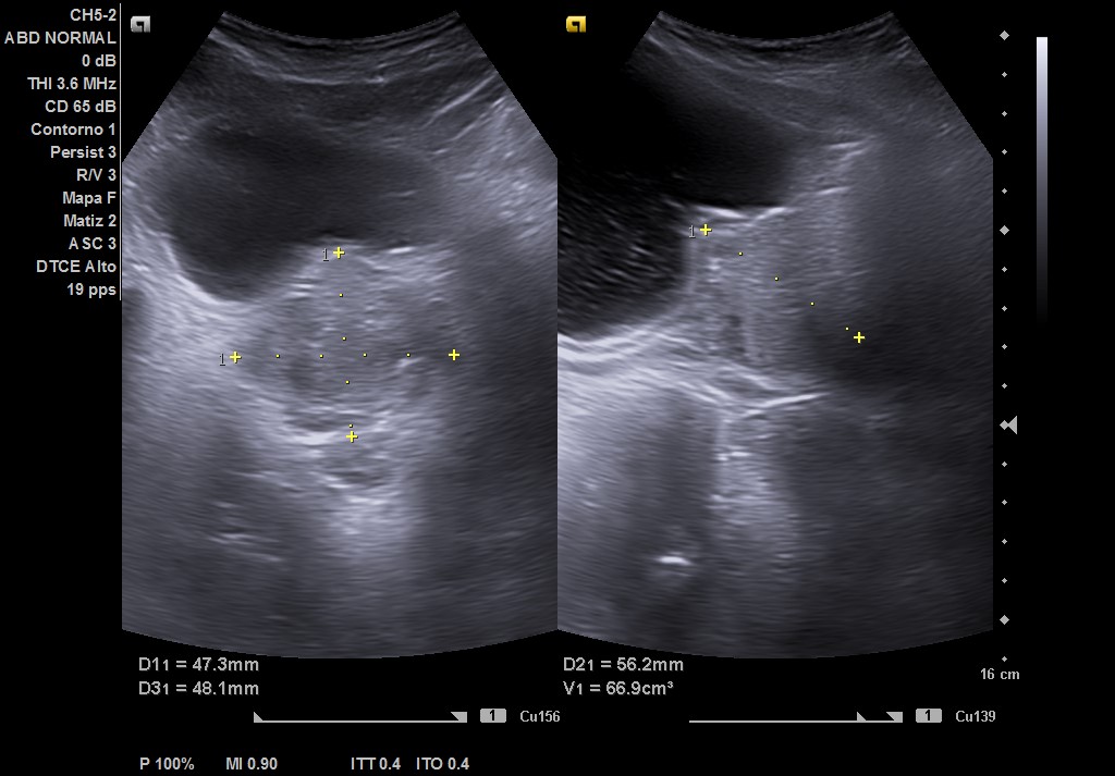 Ecografía tras ingerir 1 litro de agua y sin orinar posteriormente, con sonda convex: se visualiza vejiga repleccionada hasta 2 cm del ombligo, con > 550 cc (difícil de cuantificar por gran tamaño). Residuo postmiccional 525 cc, paredes de vejiga con signos de lucha, divertículo e imagen de «centelleo» en desembocadura de uréter derecho, pero sin afección del jet ureteral ipsilateral. Próstata de 67 cc aproximadamente, que protruye en vejiga. Riñones con ecoestructural normal sin dilatación en vía excretora.