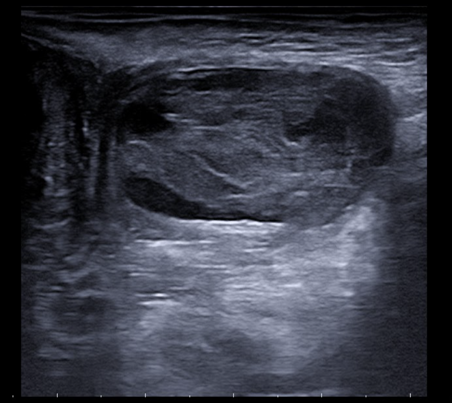 Se realiza ecografía con sonda lineal, apreciándose imagen ovalada con bordes bien definidos de contenido heterogéneo y sin captación Doppler, compatible con absceso localizado en tejido subcutáneo del labio mayor izquierdo. No se observa afectación de planos profundos, ni comunicación hacia región perianal o canal anal. No se identifican fístulas.