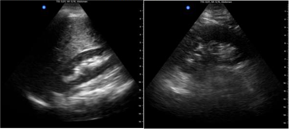 En la exploración física se objetiva molestia generalizada a la palpación abdominal que aumenta en hipogastrio. Puño-percusión positiva bilateral. Edemas bilaterales en extremidades inferiores. Se decide realizar ecoscopia a pie de cama para valoración renal y vesical.