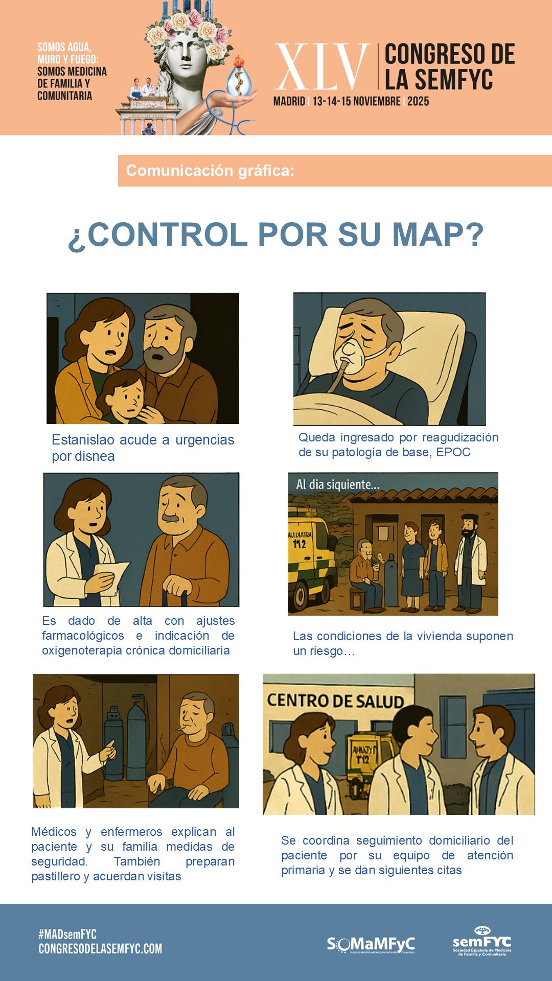 Hombre de 88 años, con importante comorbilidad: hipertenso, diabético, dislipémico, fumador con IPA de 120. Tras ingreso por reagudización de EPOC, es dado de alta hospitalaria con indicaciones farmacológicas por escrito y requerimiento de oxígeno domiciliario. Al alta, el equipo de atención primaria realiza una visita al domicilio del paciente: una habitación pequeña, construida con tablas, con una chimenea de leña encendida en el centro de esta. A su lado, la bombona de oxígeno. No dispone de electricidad, su familia dispone de un generador de gasolina. Ha fumado al alta y refiere «no entender nada» sobre la medicación pautada dado que es analfabeto. El equipo interviene: aleja bombona de oxígeno de la chimenea, pacta uso de oxígeno sin fumar simultáneamente, explica a la familia que deberán usar el generador y la implica en el tratamiento. Programan seguimiento conjunto con su médico de Atención Primaria asignado.