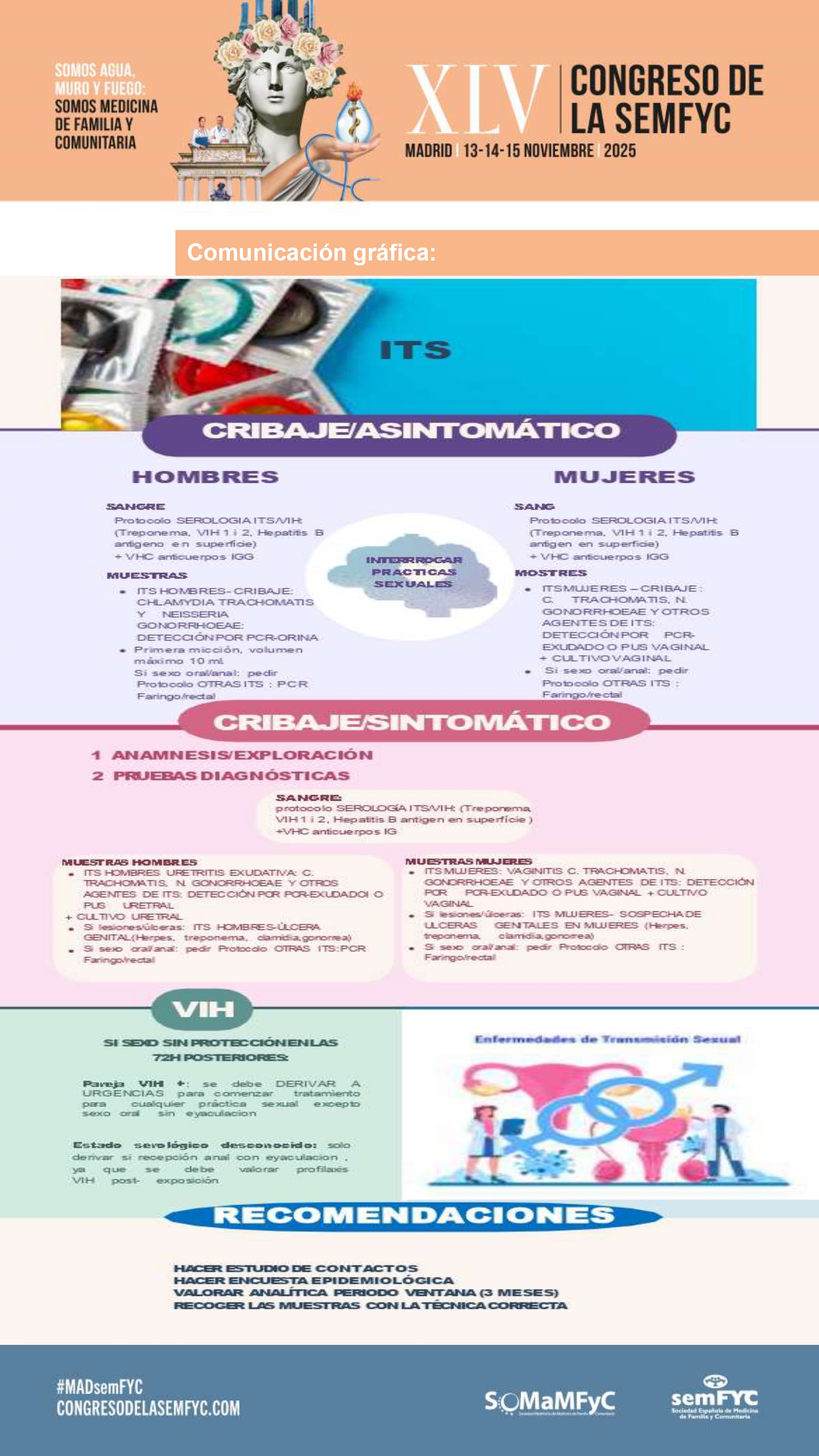 El objetivo de la comunicación es ofrecer una guía práctica y sistemática para el cribado, diagnóstico y manejo de las infecciones de transmisión sexual (ITS) en hombres y mujeres. Se busca estandarizar las actuaciones clínicas, optimizar la recogida de muestras, orientar el uso de pruebas diagnósticas y garantizar un abordaje integral que incluya tanto la detección de casos como la prevención y el seguimiento de contactos.