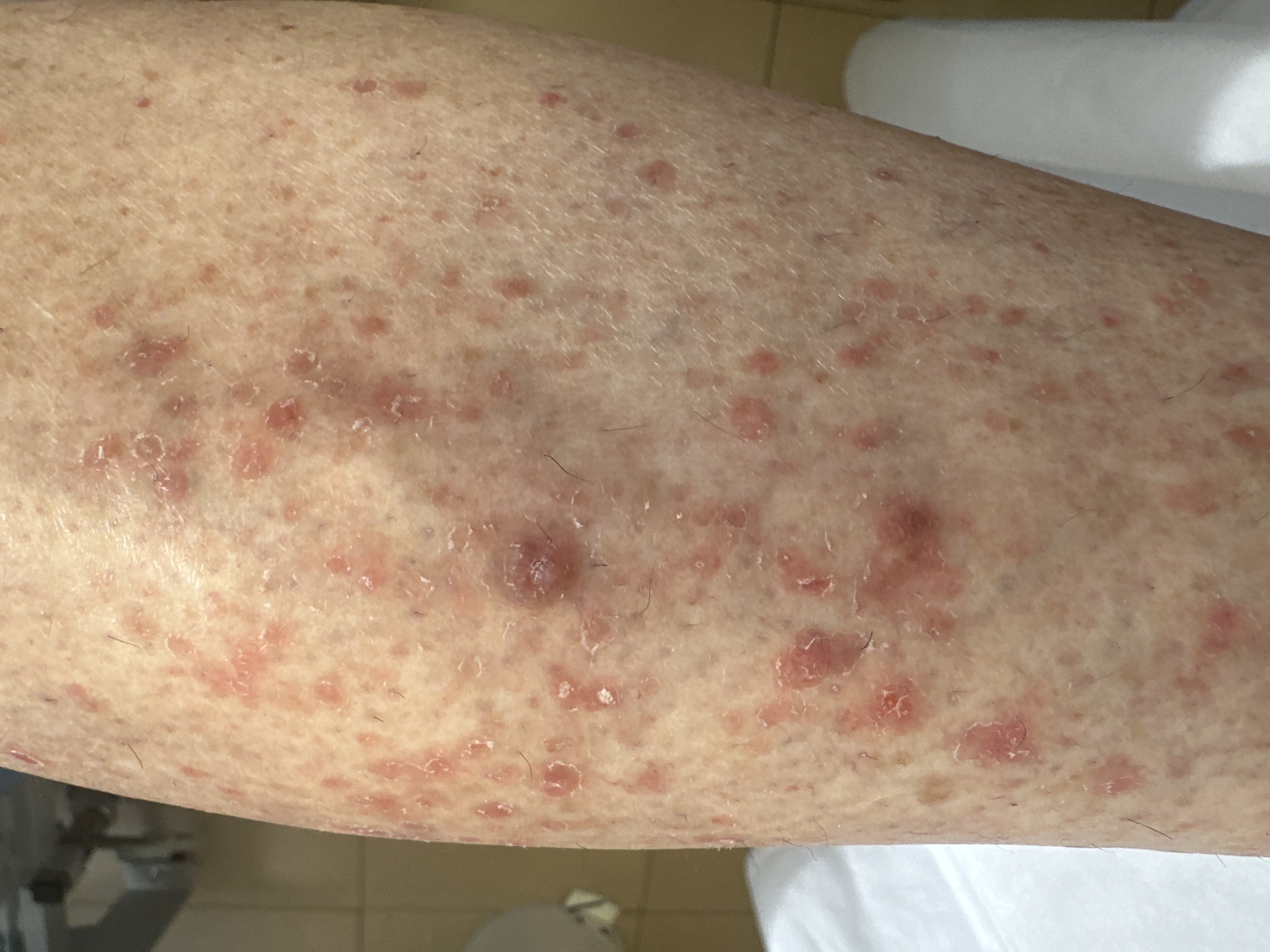 Paciente mujer de 57 años con antecedente de hipertensión arterial y dislipemia, que acude por lesiones cutáneas de semanas de evolución que son pruriginosas e inician en tobillos y ascienden de forma progresiva hacia rodillas y resto de extremidades incluyendo palmas y plantas, así como tronco. Respetan zona facial y cuero cabelludo. Niega transgresiones dietéticas o de su medicación habitual. Niega viajes recientes o uso de nuevas cremas hidratantes, desodorantes o detergentes. No relaciones sexuales de riesgo.