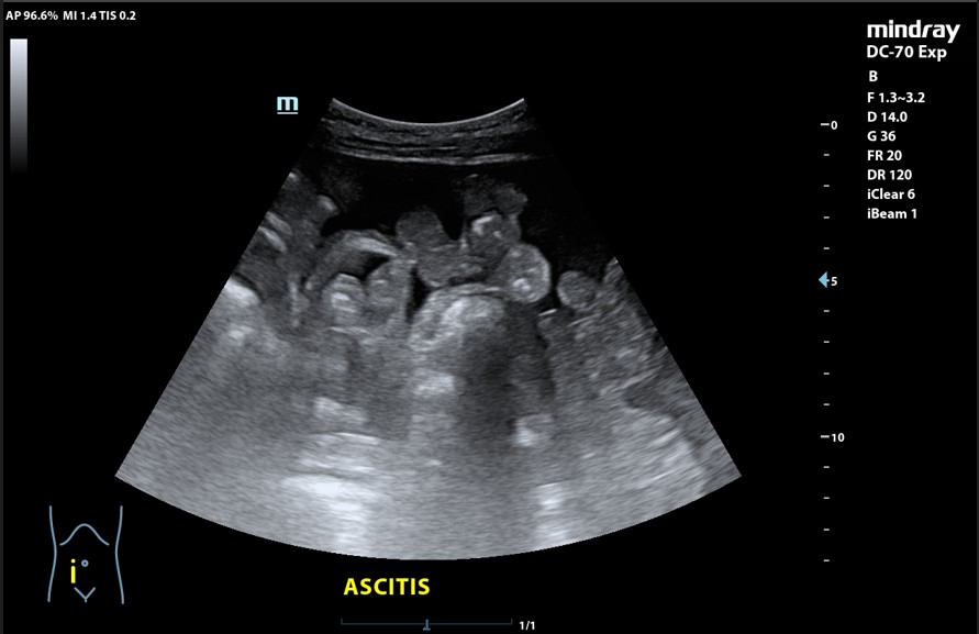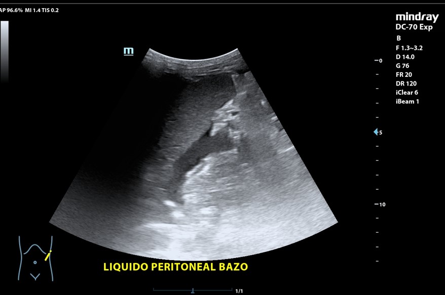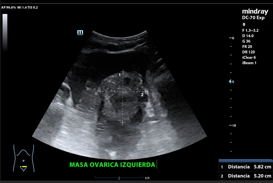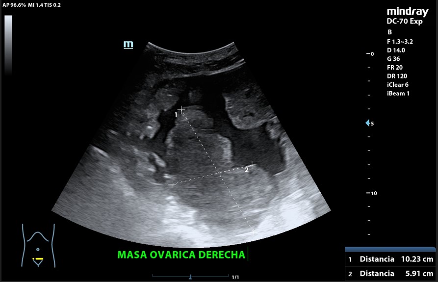 Presencia de 2 masas pélvicas bien delimitadas heterogéneas que captan Doppler, una de 5 cm de diámetro y otra ovalada de 10 cm de longitud. Líquido ascítico peritoneal, que también se observa alrededor del bazo y en espacio de Morrison. Derrame pleural derecho.