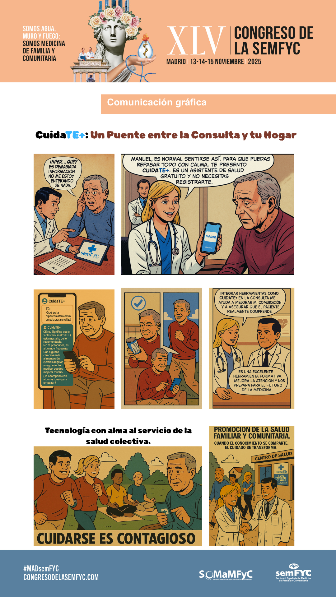 Mostrar cómo una herramienta digital desarrollada desde Atención Primaria puede convertirse en un puente real entre la consulta y el hogar. CuidaTE+ es un chatbot personalizado, creado con tecnología ChatGPT (GPT-4) y configurado para responder exclusivamente con información sanitaria fiable, comprensible y contrastada, basada en fuentes validadas como la SEMFYC, la OMS y Escuelas de Pacientes. Además de empoderar al paciente, busca introducir a los residentes en el uso clínico, ético y práctico de la inteligencia artificial.