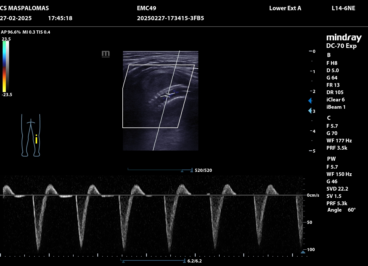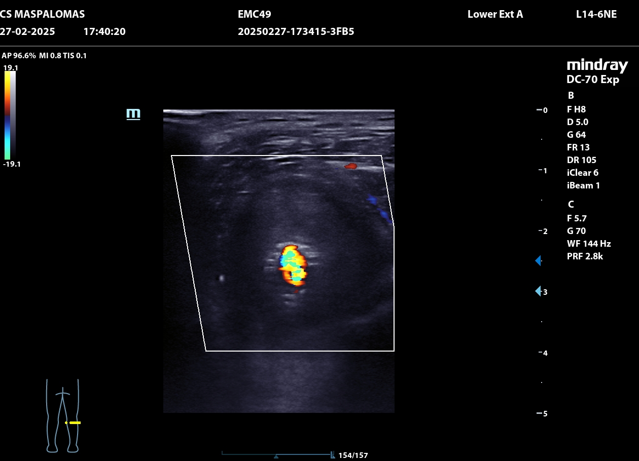 Se realiza ecografía clínica en consulta que revela un aneurisma de la arteria poplítea derecha de 4,66 cm con trombo intraluminal de gran tamaño.