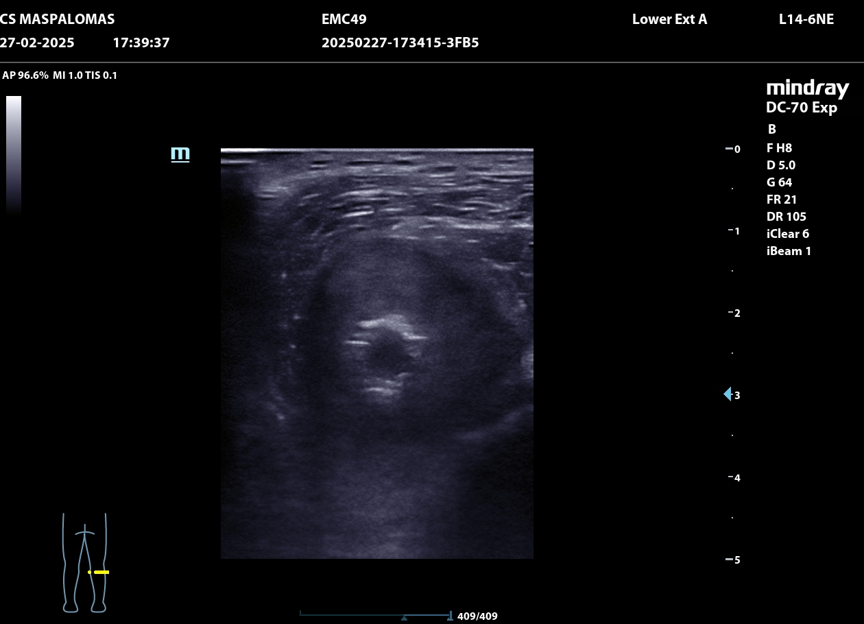 Hombre de 50 años, sin antecedentes de interés, consulta por dolor y bulto en el hueco poplíteo de 1 mes de evolución, sin fiebre ni signos de infección. A la exploración física, se observa un bulto en hueco poplíteo de 3 x 4 cm, de consistencia blanda y adherida, con resto de exploración anodina.