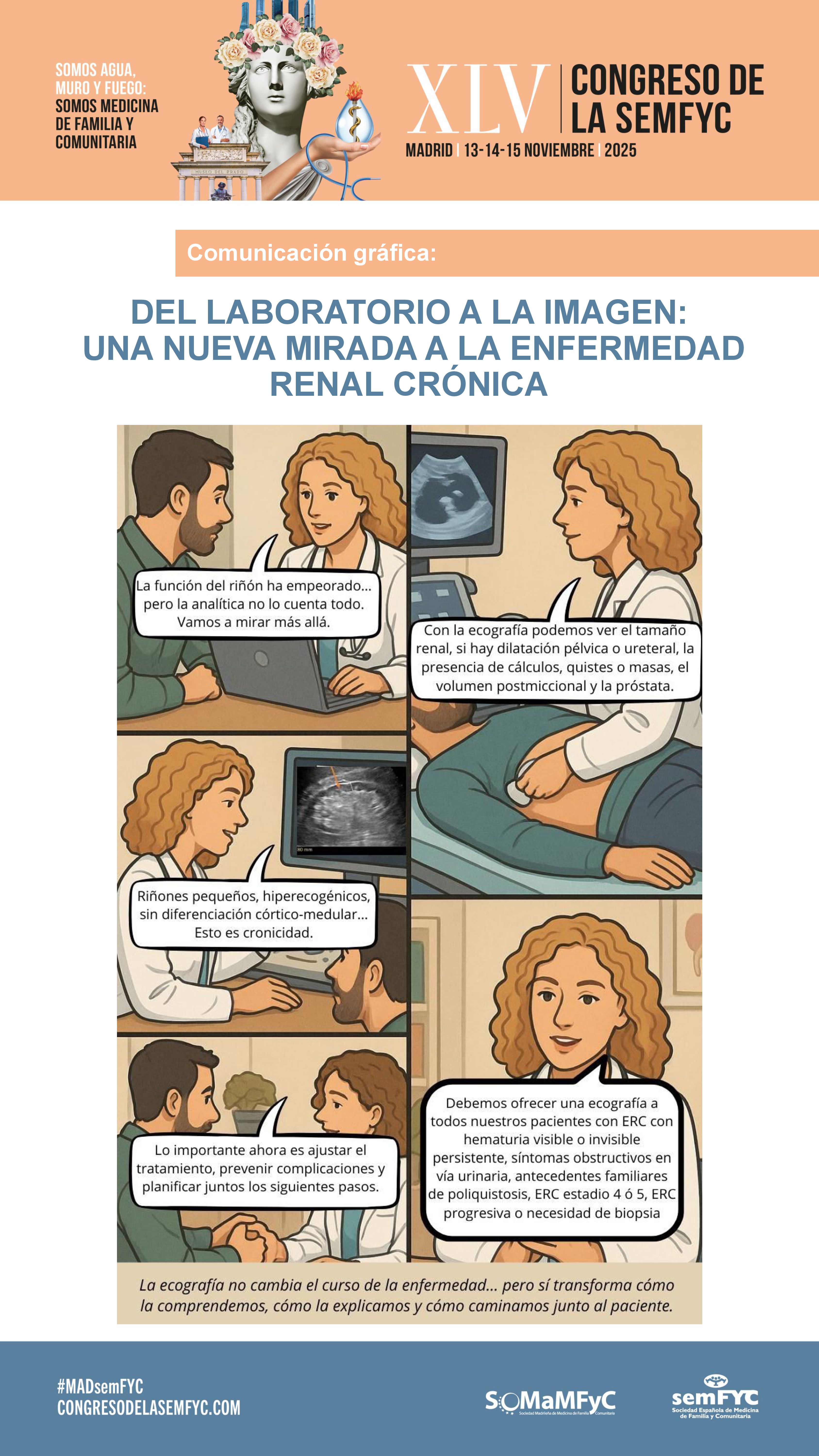 La infografía utiliza un formato tipo cómic para representar una situación clínica habitual: el seguimiento de un paciente con enfermedad renal crónica. A través de una conversación entre médico y paciente, se plantea la necesidad de ir más allá de los datos analíticos para comprender mejor el estado del riñón y así orientar la toma de decisiones clínicas. La ecografía se presenta como una herramienta clave que permite evaluar múltiples parámetros estructurales y funcionales: tamaño renal, ecogenicidad, diferenciación córtico-medular, presencia de dilataciones, litiasis, quistes, masas, calcular el volumen postmiccional y el estado de la próstata. La figura culmina destacando los escenarios clínicos en los que la ecografía debe considerarse en pacientes con enfermedad renal crónica, promoviendo así un abordaje más completo, anticipatorio y centrado en el paciente.