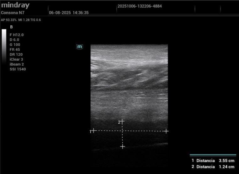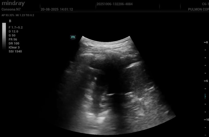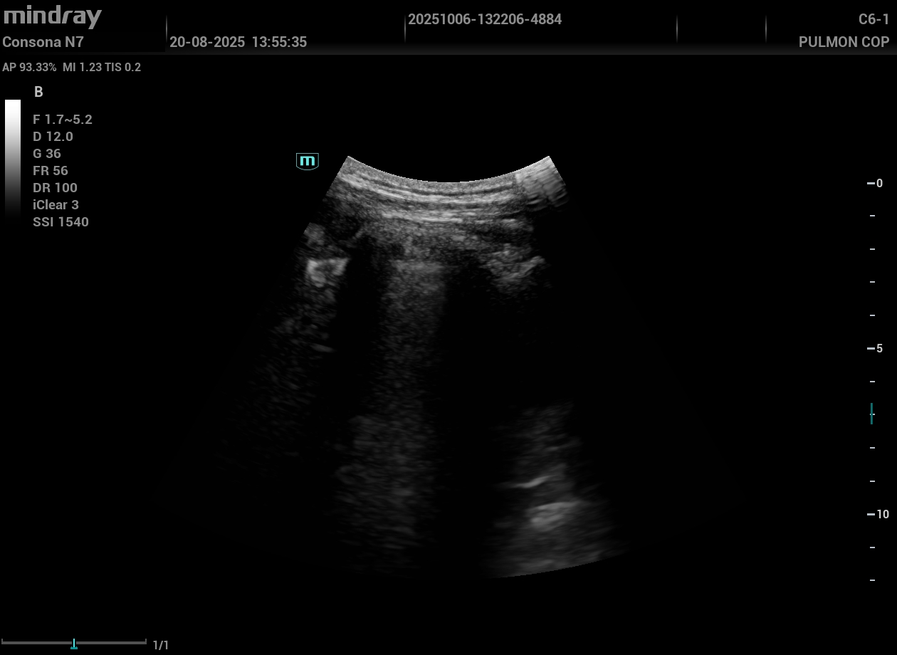 Eco pulmonar: colección anecoica con pérdida parcial del deslizamiento; compatible con derrame pleural de cuantía moderada.