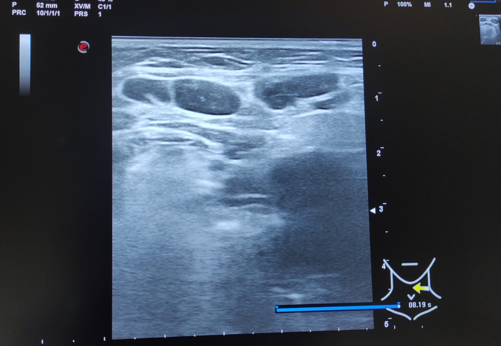 Mujer de 73 años con antecedentes personales de HTA, espondiloartrosis, glaucoma y Linfocitosis B-Lambda monoclonal. Anamnesis: acude por cuadro catarral de dos semanas de evolución con odinofagia, disfonía y expectoración blanco-amarillenta y sofocos que se producen durante las comidas. Exploración física: orofaringe muy eritematosa sin exudados, se palpan múltiples adenopatías cervicales bilaterales de gran tamaño y adheridas, Auscultación cardiaca: Rítmica sin soplos, Auscultación pulmonar: algún sibilante disperso. Se realiza ecografía por desproporción entre las adenopatías y la clínica de la paciente y no mejoría en una semana tras tratamiento antibioterápico más corticoides orales.