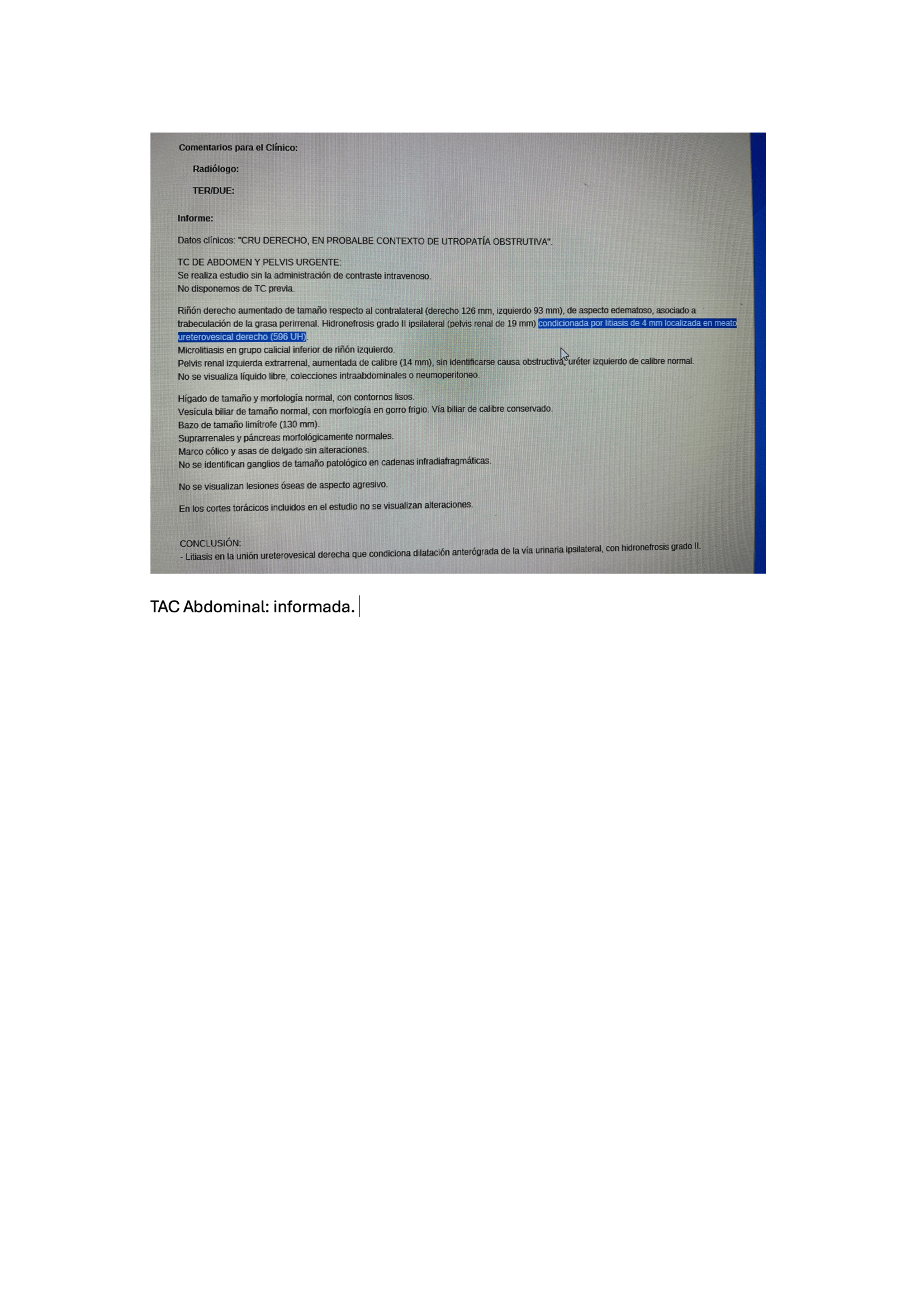 Paciente de 49 años, APP: hiperuricemia no controlada, múltiples episodios de cólico renal (CRU). dolor de aparición progresiva en región lumbar de 10 días de evolución, intensidad moderada-fuerte, carácter cólico, que se irradia hacia la región inguinal ipsilateral. El dolor está asociado a mareos, náuseas sin vómitos. A pesar de recibir tratamiento con relajantes musculares y antiinflamatorios por su médico de familia, el dolor empeora, y presenta orina colúrica y fétida por lo que acude a urgencias.