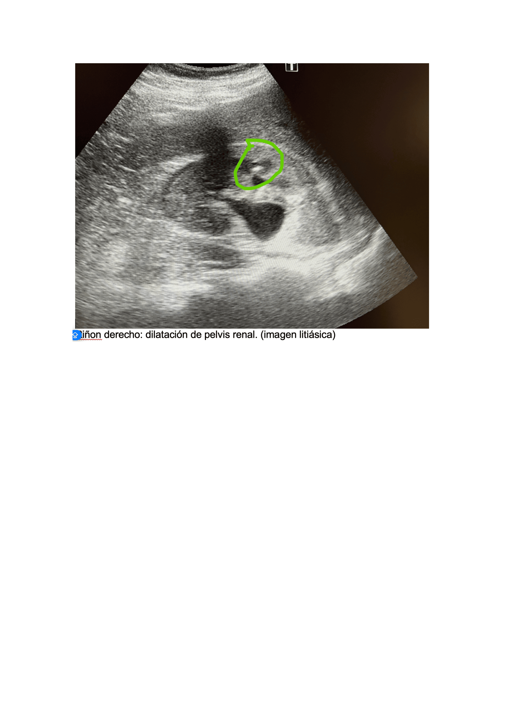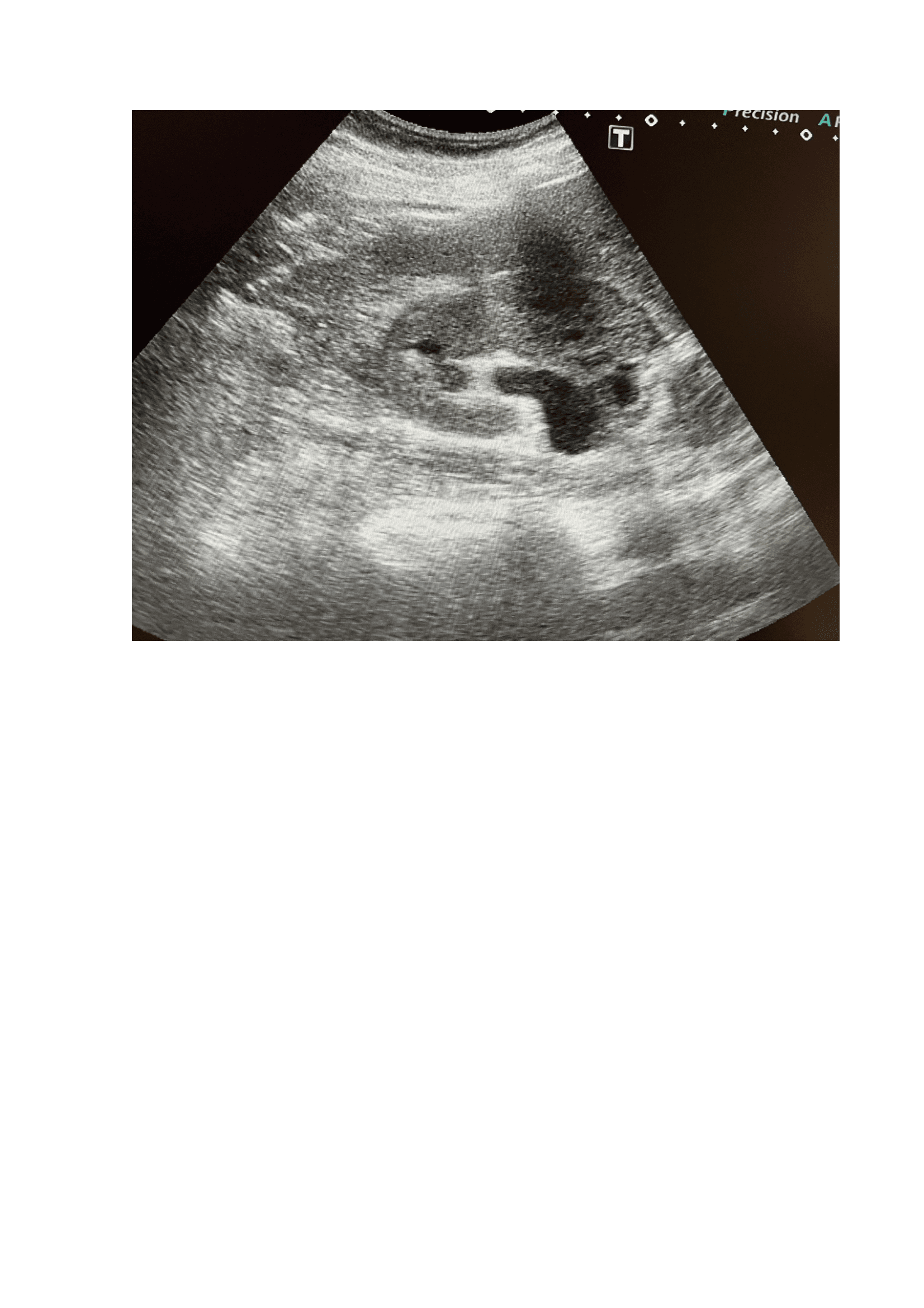 Exploración física, fiebre (39,5 °C) y taquicardia (FC: 120), puño-percusión positiva en la fosa lumbar derecha, sugiriendo una patología renal. Se realiza POCUS) que revela un riñón derecho aumentado de tamaño con una imagen lítica compatible con un cálculo renal de 1,2 cm x 8 mm, junto con dilatación de la pelvis renal (hidronefrosis grado I-II). Una tomografía computarizada (TAC) confirma los hallazgos y muestra un cálculo renal de 4 mm en la zona vesicoureteral distal, no obstruyendo totalmente la vía urinaria.