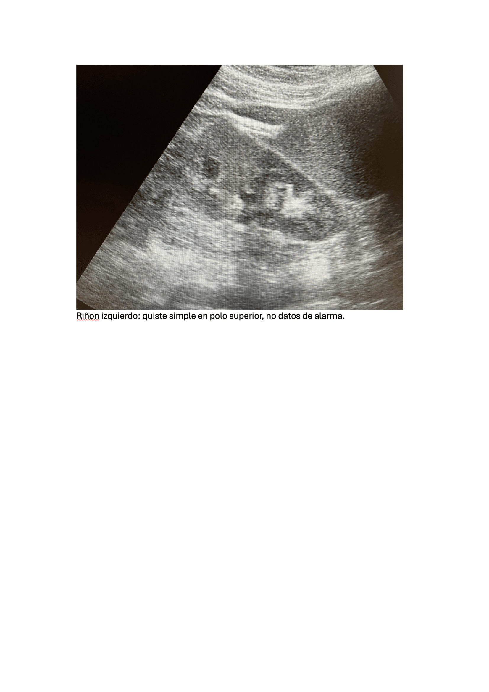 Urología: evidencia mejoría del cuadro clínico, niega fiebre, dolor. Refiere expulsión de pequeño cálculo tras 5 días de tratamiento. Ecografía, Riñón de tamaño normal, homogéneo, se evidencia imagen litiásica que deja sombra acústica posterior de 1,2 cm x 9 mm aprox. que no compromete vía urinaria, no dilatación de pelvis renal. Se deja tratamiento con tamsulosina durante 3 meses hasta nueva valoración. Control con su médico de familia, solicitar seguimiento de niveles ácido úrico y si alteración pautar tratamiento.