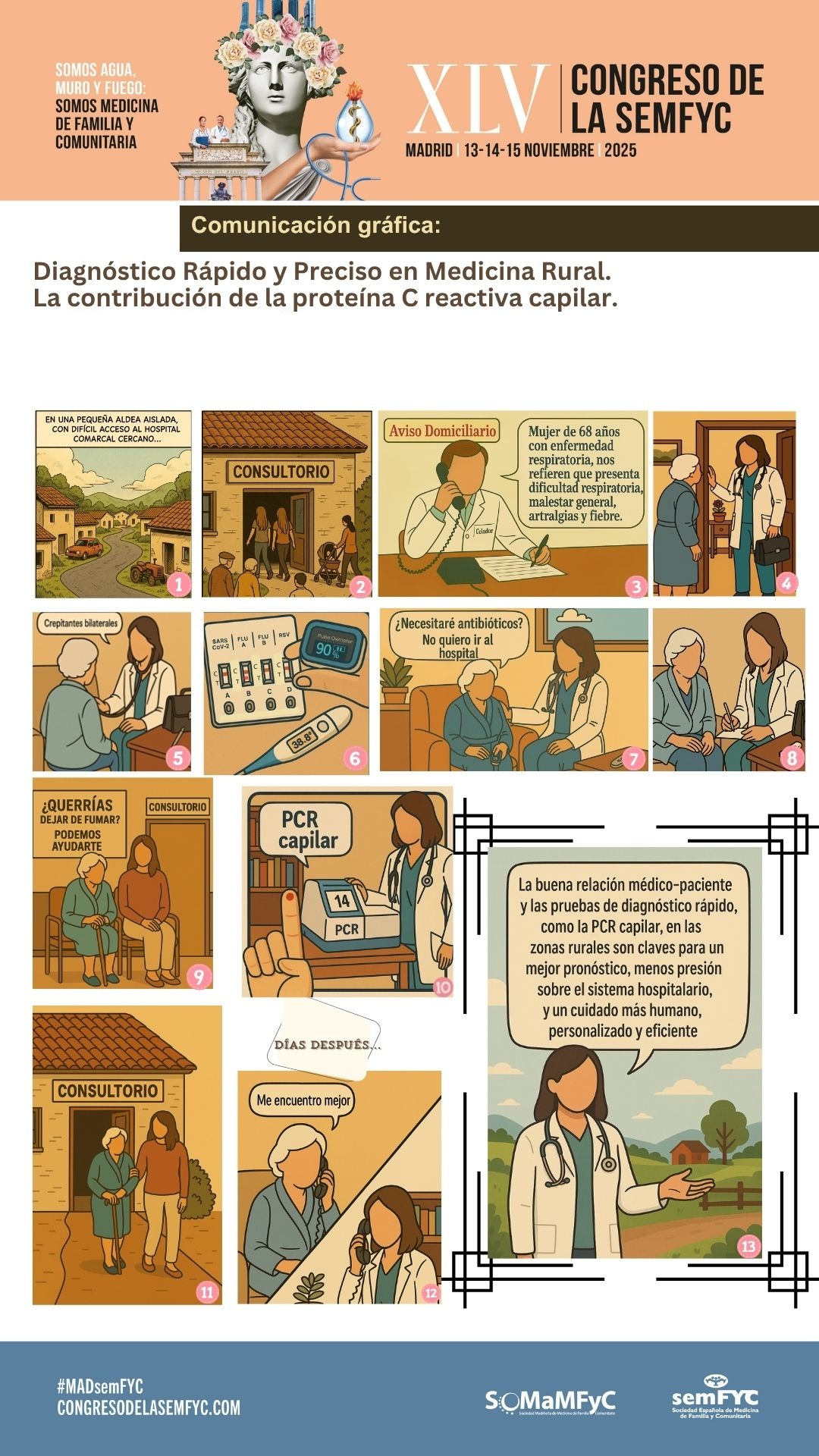 Se presenta un cómic compuesto por trece viñetas numeradas, con un diseño retro y una paleta cromática cálida que evocan la esencia del entorno rural. A través de un caso clínico, se ilustra el recorrido asistencial de una mujer de 68 años con enfermedad respiratoria aguda, desde el aviso domiciliario hasta su seguimiento evolutivo. La secuencia muestra la valoración clínica integral y el uso de pruebas complementarias in situ, como los test de antígenos y la proteína C reactiva capilar, destacando el respeto a las decisiones de la paciente. La narrativa enfatiza el papel del médico de familia en la prevención de complicaciones, evitando derivaciones y hospitalizaciones innecesarias mediante el empleo de recursos diagnósticos disponibles en el propio consultorio. Todos los personajes se representan sin rasgos faciales, reforzando el carácter universal y transversal del acto asistencial.