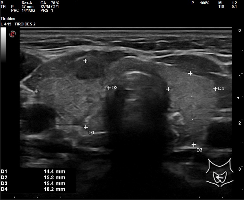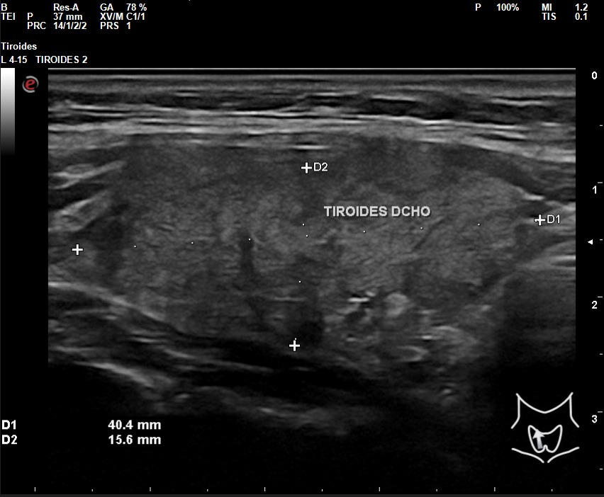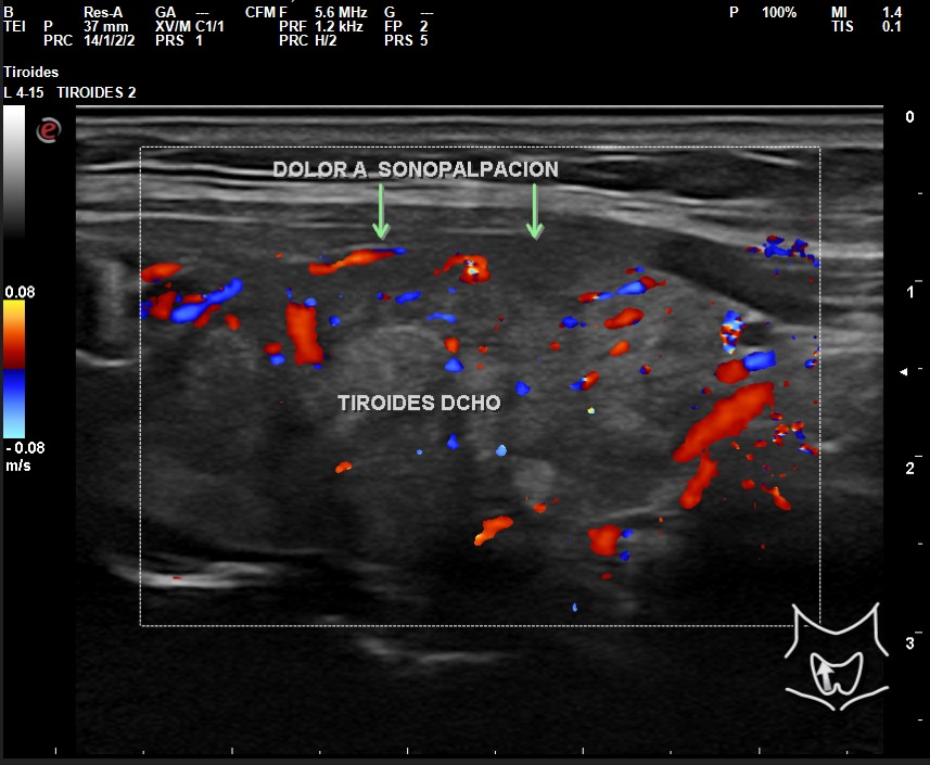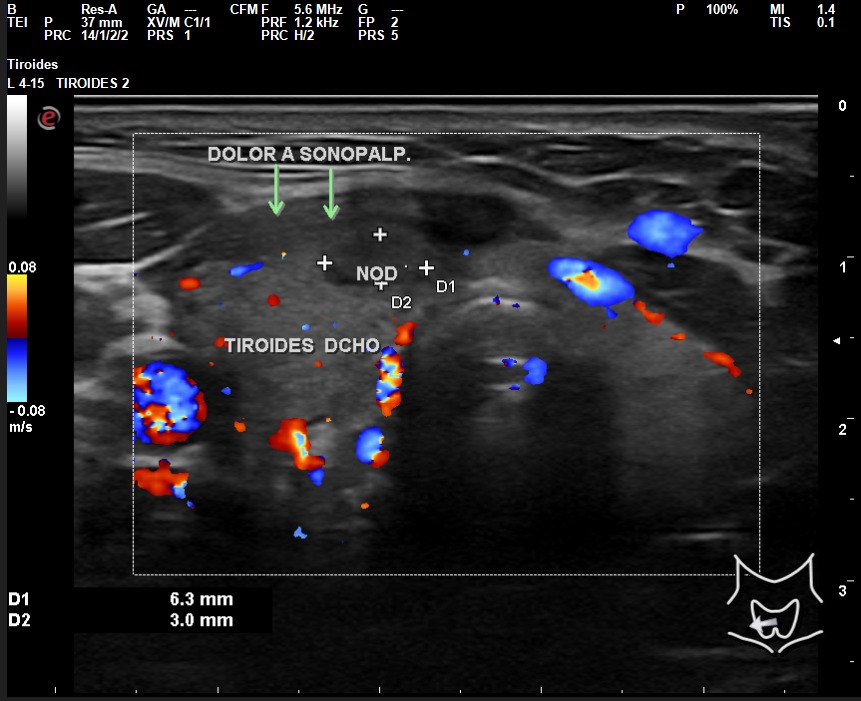 A la exploración ecográfica se observa en lóbulo tiroideo derecho áreas irregulares hipoecoicas sensibles a la sonopalpación con el transductor, con un ligero incremento de la actividad Doppler, asociado a la presencia de adenopatías de características reactivas y/o inflamatorias.
