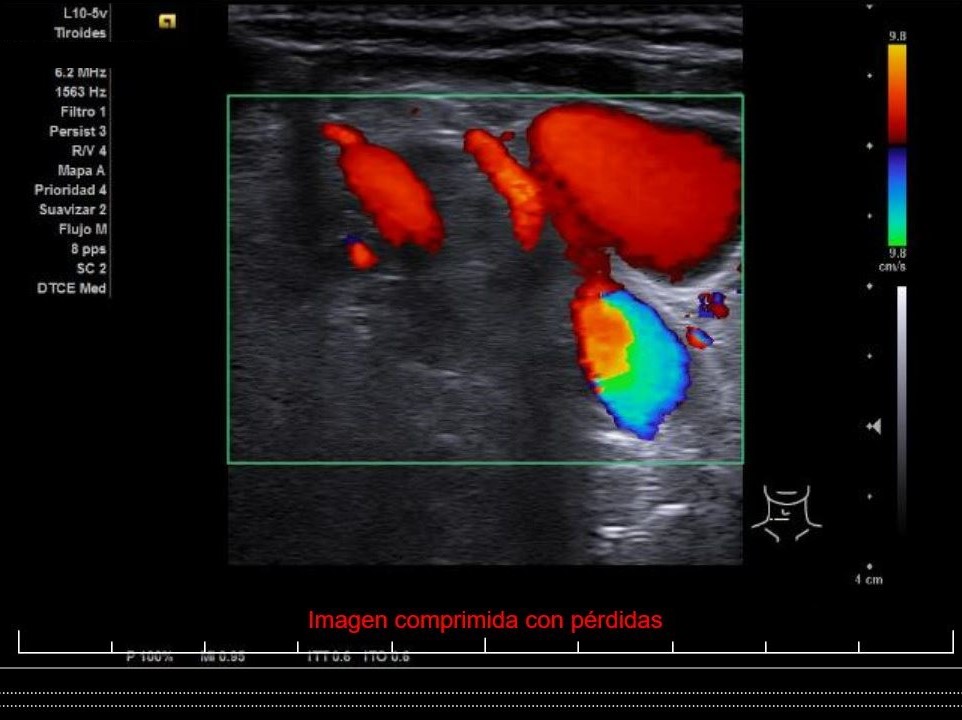 Se aprecia un tiroides de características ecográficas compatibles con tiroiditis, sin cambios respecto a ecografía previa, al igual que la grasa peritiroidea derecha, pero de manera incidental se observa un aumento del calibre fusiforme de la yugular externa derecha con respecto a la izquierda, con flujo vascular reducido.
