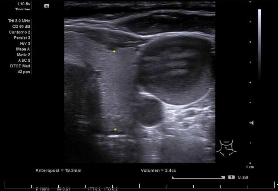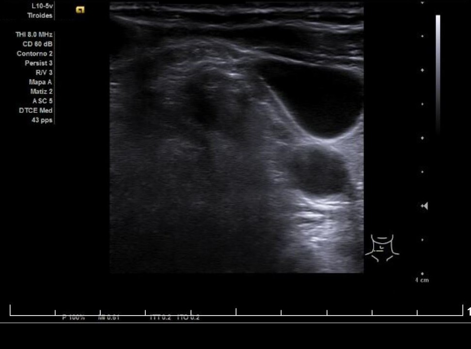Paciente mujer de 63 años con antecedente personal de tiroiditis de Hashimoto y aumento de la grasa peritiroidea derecha que acude a consulta de su médico de familia por notarse aumento de volumen cervical anterior derecho de alrededor de una semana de evolución, negando dolor u otra clínica. A la exploración se palpa bocio ya conocido, con aumento de volumen cervical anterior derecho respecto de izquierdo, sin distinguir masa clara a la palpación. Es por la falta de claridad en la palpación que se decide realizar ecografía exploratoria durante el mismo acto clínico.