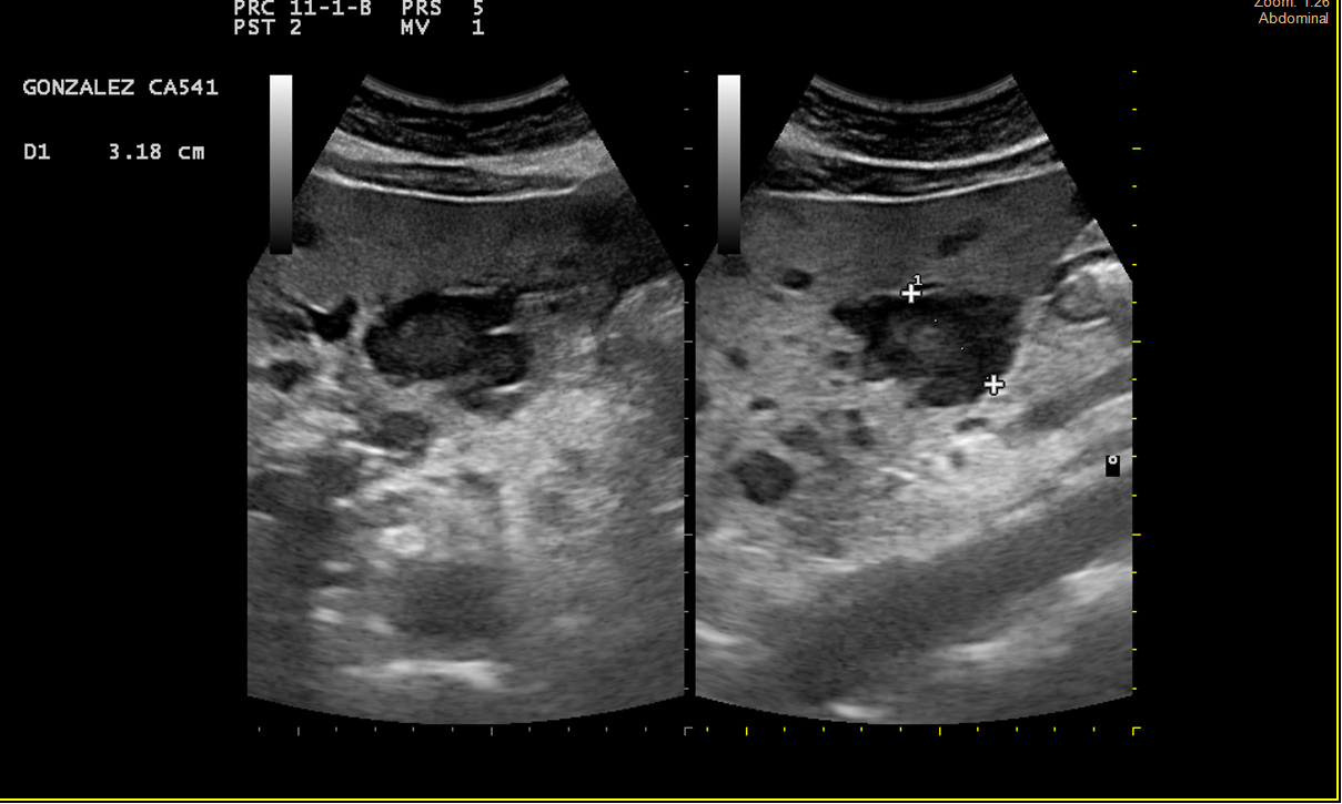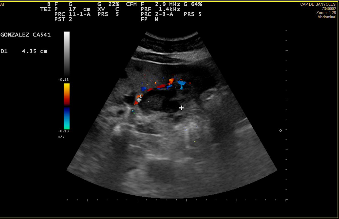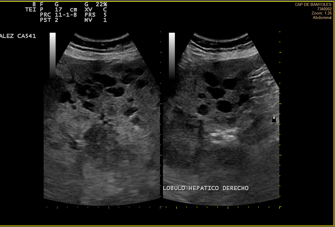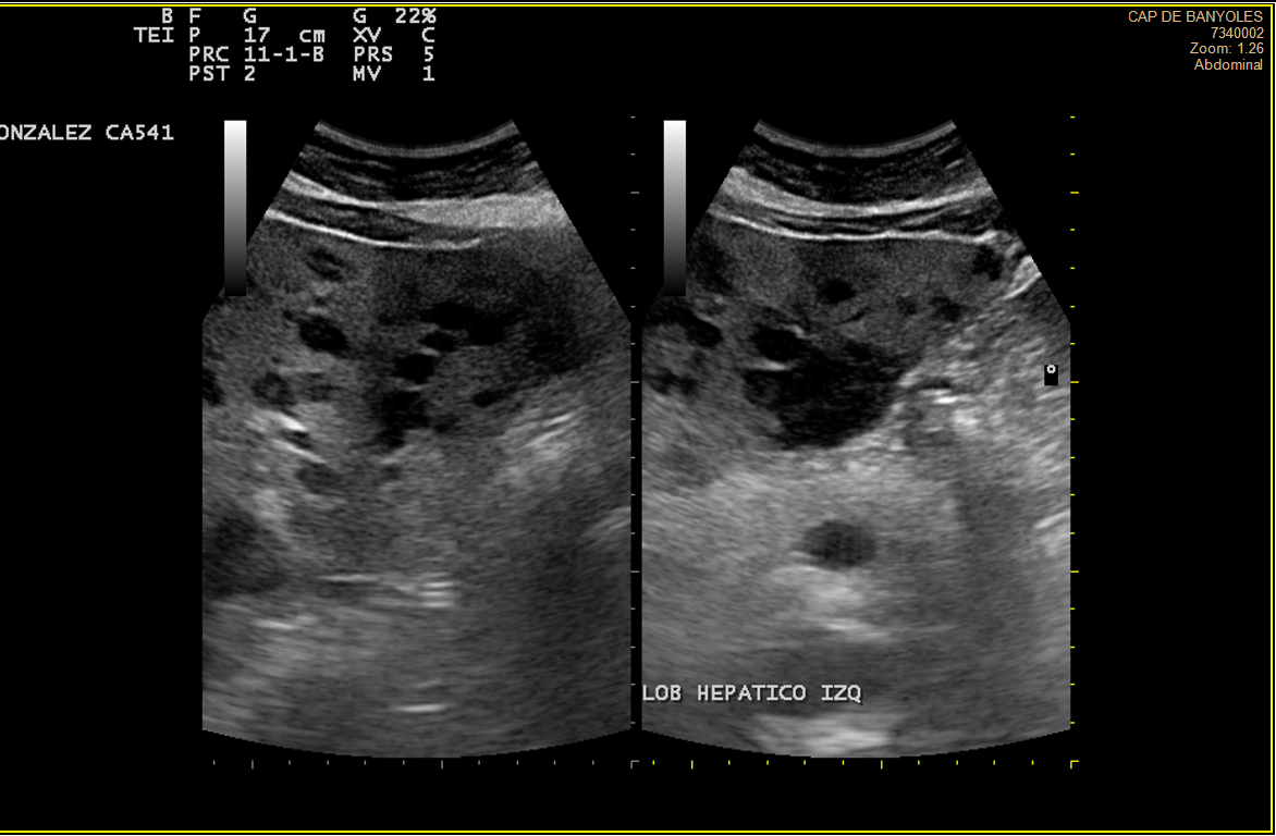 Alteración difusa de la ecoestructura hepática, presentando múltiples imágenes hipoecoicas, de diversos tamaños, resaltando una lesión en lóbulo hepático derecho de 3cm, tabicada y con ecos en su interior, con componente vascular asociado. Vesícula de aspecto normal.