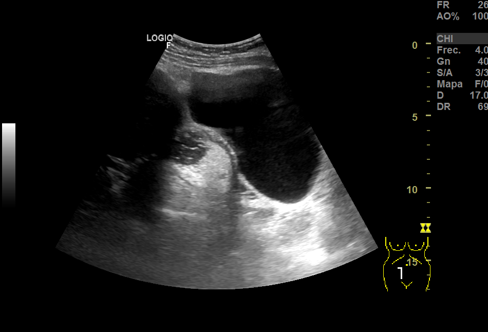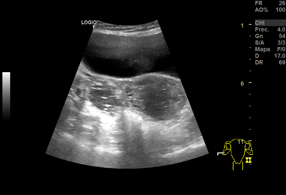 Realizamos una ecografía en el centro de salud y objetivamos, adyacente a útero, una imagen heterogénea de gran tamaño (15x8 cm), con vascularización, que podría corresponder a un mioma gigante. En anejo derecho, imagen redondeada de aproximadamente 3 cm en cuyo interior aparecen líneas hiperecogénicas en un fondo hipoecoico que podrían corresponder a teratoma, sin descartar otra patología. Ante la duda, derivamos a ginecología.