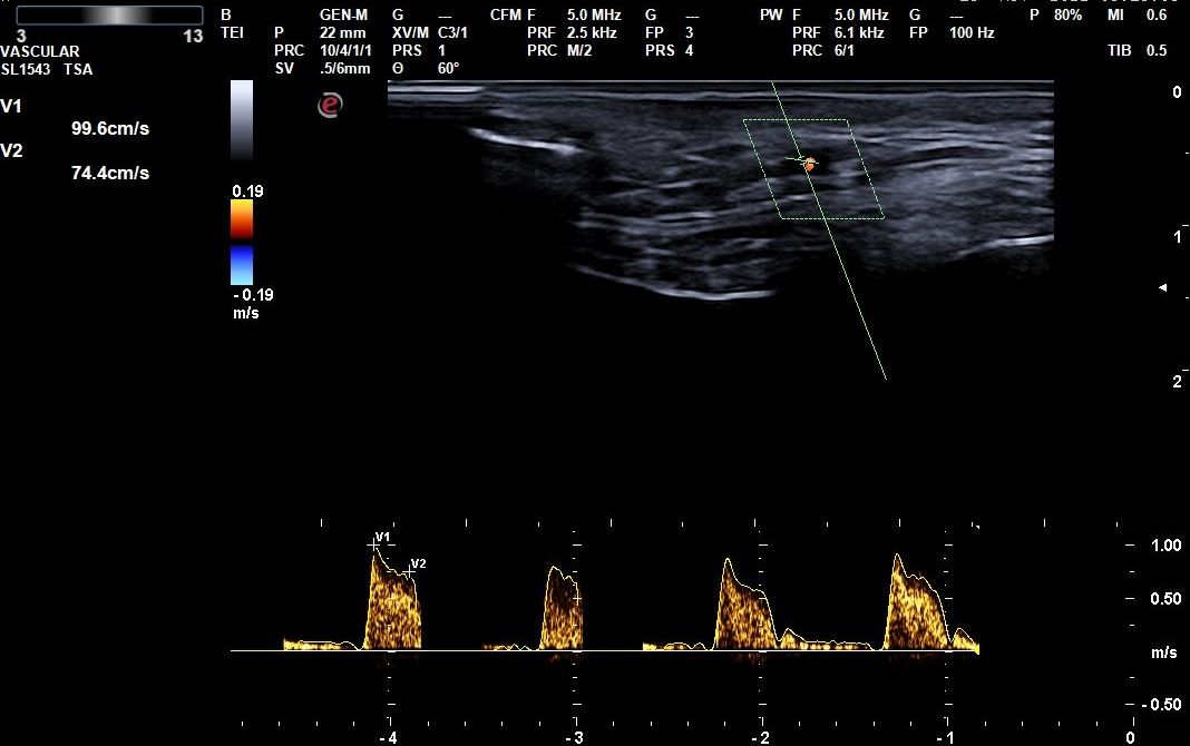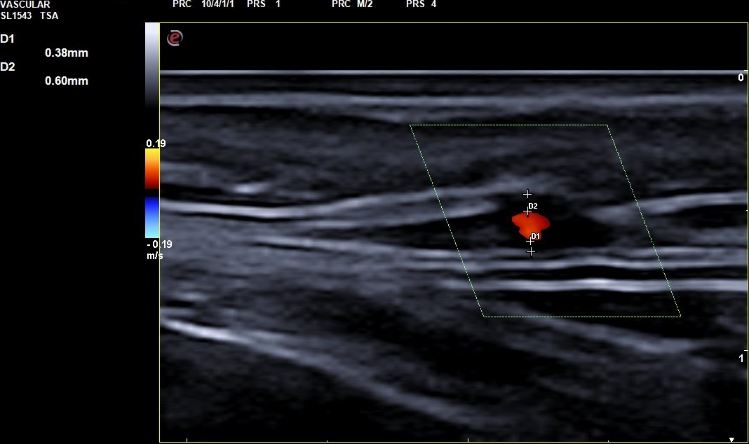 Hombre de 82 años que refiere sensación de opresión frontal acompañada de rubicundez facial e inquietud, se quita con paracetamol y se repite a lo largo del día. Asocia polimialgia reumática. No claudicación mandibular ni alteraciones visuales. Pulsos temporales conservados y simétricos y no cordón arterial. Se realiza ecografía clínica para la valoración de las arterias temporales por el AP de polimalgia reumática.