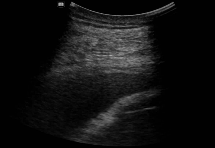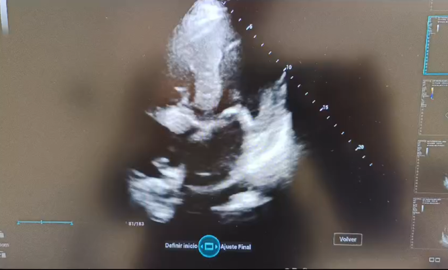 2.ª ecocardioscopia POCUS: derrame pleural, septo ventricular engrosado, hipoquinesia severa global, patrón de llenado ventricular restrictivo y derrame pericárdico.