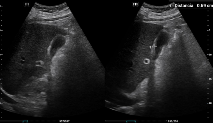 1.ª ecografía: hepatomegalia, distensión de venas suprahepáticas y vesícula biliar de paredes engrosadas.