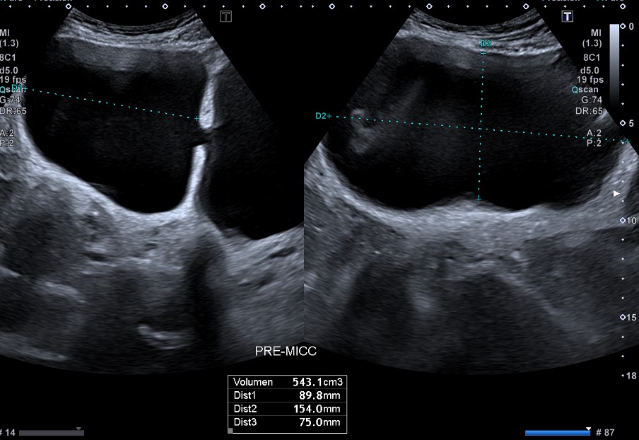 Riñones de tamaño y morfología normales. No observamos litiasis ni dilatación de la vía urinaria. A nivel de la vejiga presenta un tabique con comunicación a una gran cavidad en la pared lateral derecha que da la impresión de que existen dos vejigas urinarias. No hay lesiones parietales. Próstata 32 cc. Volumen premiccional de la cavidad mayor 350 cc y posmiccional 210 cc.Pruebas complementarias