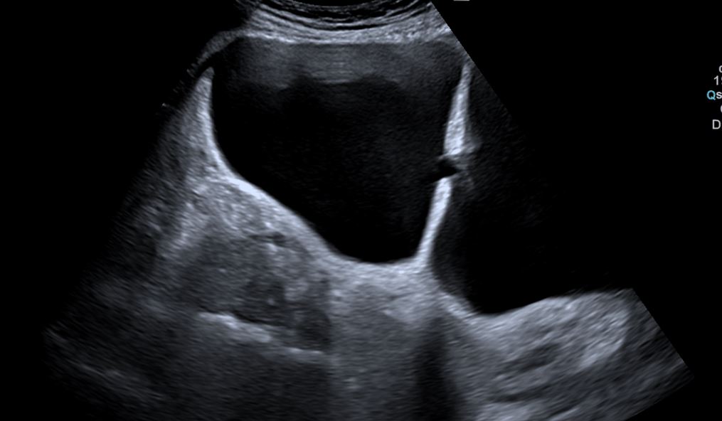 Paciente de 67 años que refiere síntomas de unos 3 años de evolución consistentes en polaquiuria, disminución del chorro miccional, nicturia, sensación de vaciado incompleto y ocasionalmente urgencia miccional. No presenta hematúria, disuria ni dolor abdominal.Hallazgos ecográficos