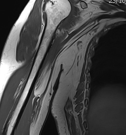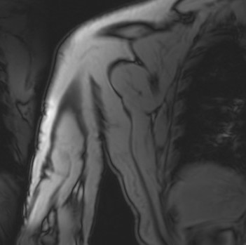 Ante estos hallazgos sin saber concretar la naturaleza clara de la lesión, se solicita una resonancia magnética (RMN) preferente. La RMN informa de una lesión homogénea, bien definida, dependiente del músculo coracobraquial, de 35 × 18 × 82 mm, con finos septos internos sin engrosamientos nodulares, compatible con lipoma intramuscular.
