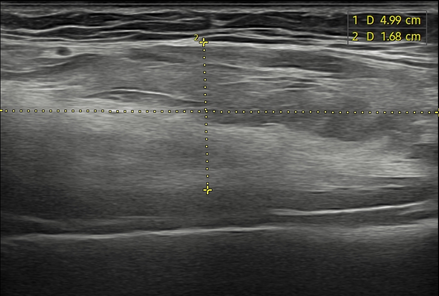 Paciente de 62 años, sin antecedentes personales de interés, que acude a consulta derivado por su fisioterapeuta ante la aparición de un "bulto" en el brazo derecho de dos meses de evolución. El paciente niega dolor, refiriendo únicamente molestias ocasionales. En la exploración física se palpa una masa de consistencia intermedia en la cara interna del brazo, a nivel del bíceps/braquial anterior.