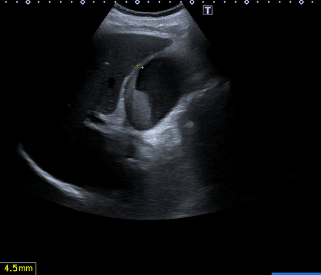 Se administra analgesia por vía endovenosa, sin mejoría. Se remite a urgencias hospitalarias, donde se realiza analítica de sangre y ecografía abdominal, confirmándose la sospecha diagnóstica de colecistitis aguda.