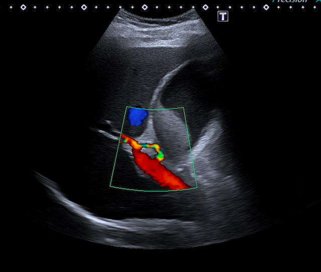 Se realiza una exploración abdominal, donde se objetiva distensión de la vesícula biliar, con un diámetro longitudinal de 10 cm, y engrosamiento de la pared de 4 mm (figura 1), abundante barro biliar (figura 2) y la presencia de una litiasis en cuello vesicular (figura 3). Murphy ecográfico positivo. Doppler negativo, sin dilatación de la vía biliar (figura 4). No líquido perivesicular. Resto de rastreo sin alteraciones.