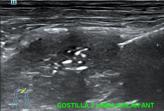 Eco clínica costal: en 3ª y 4ª costillas izquierdas, a nivel de línea axilar anterior, se visualiza lesión que rompe y destruye la cortical infiltrando partes blandas. Hipervascularización con Doppler color.