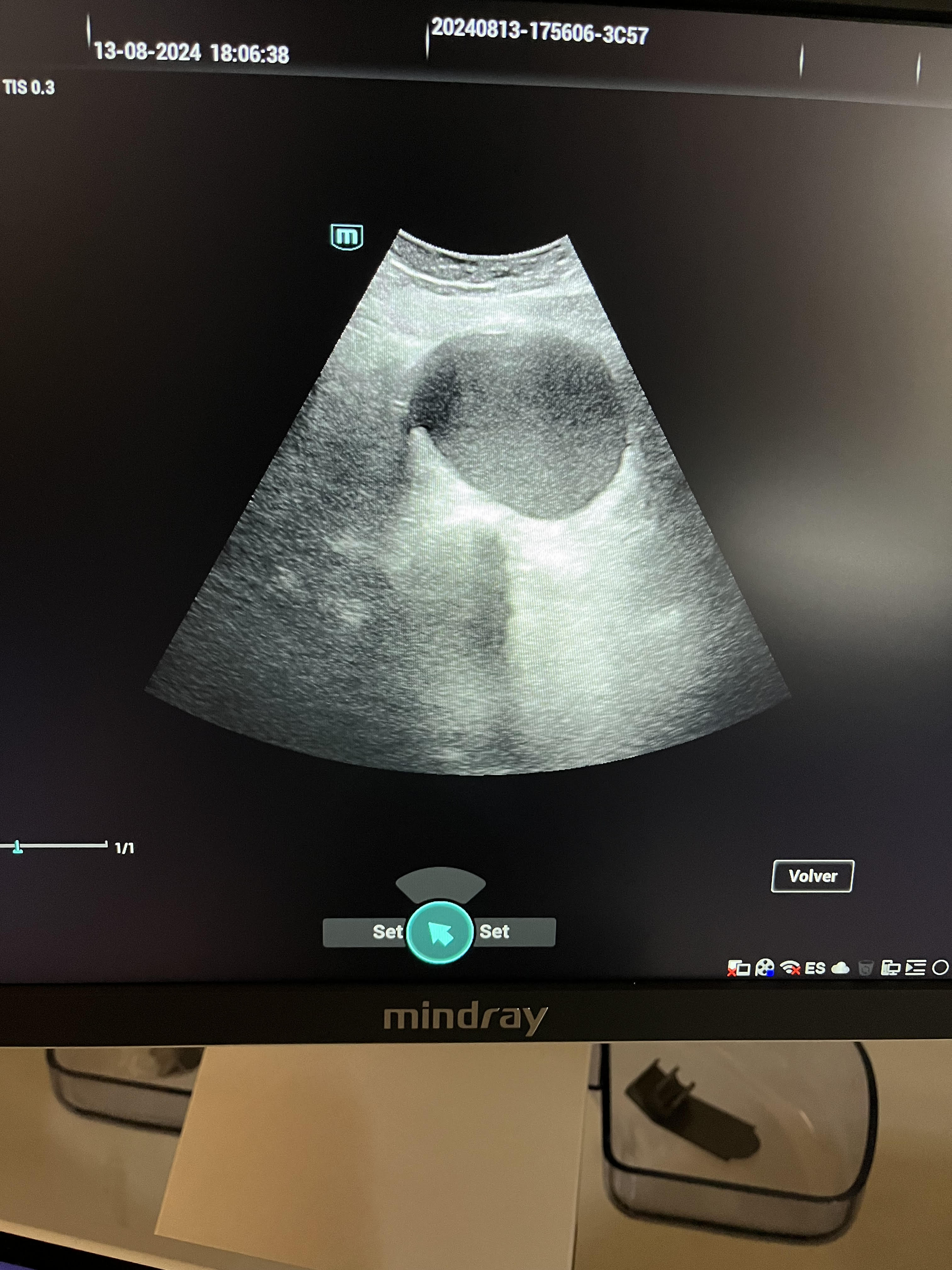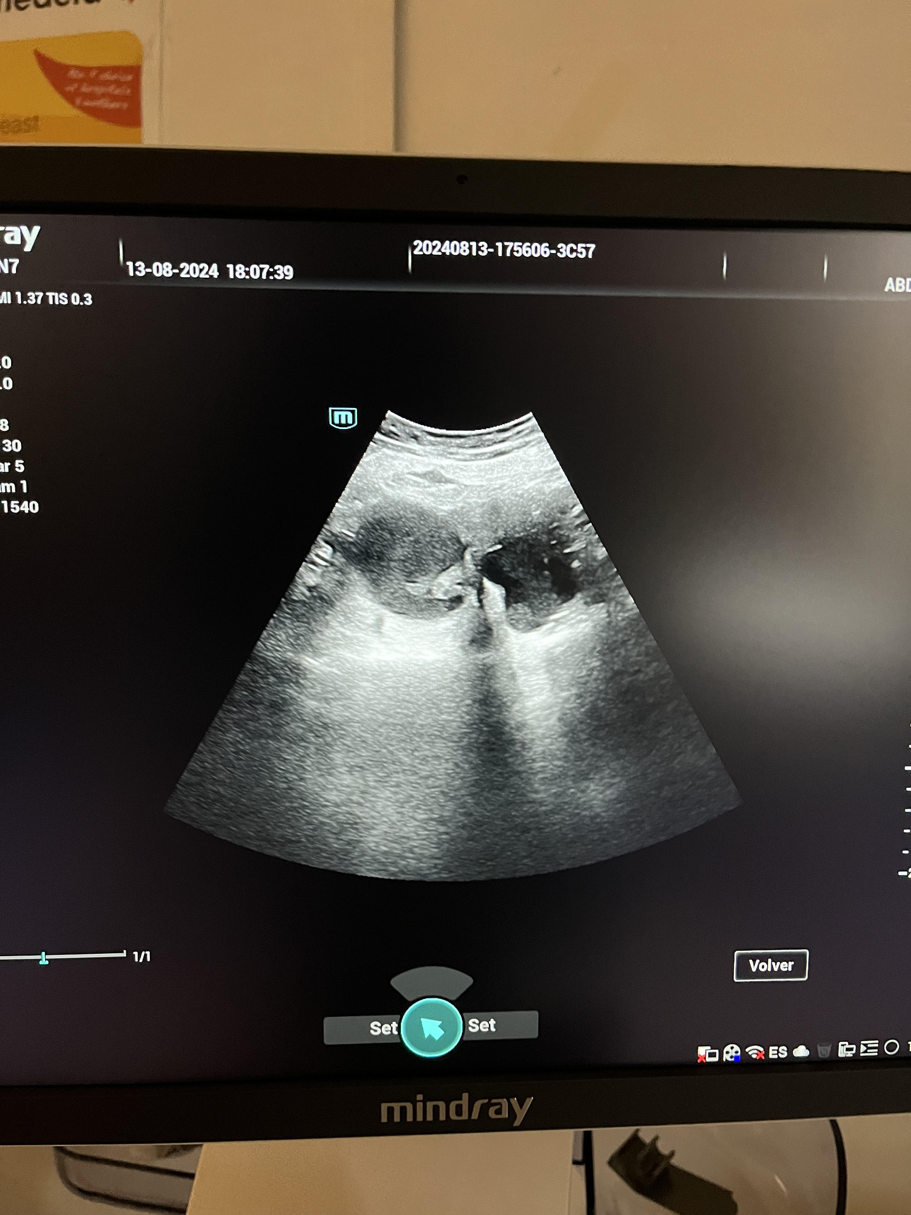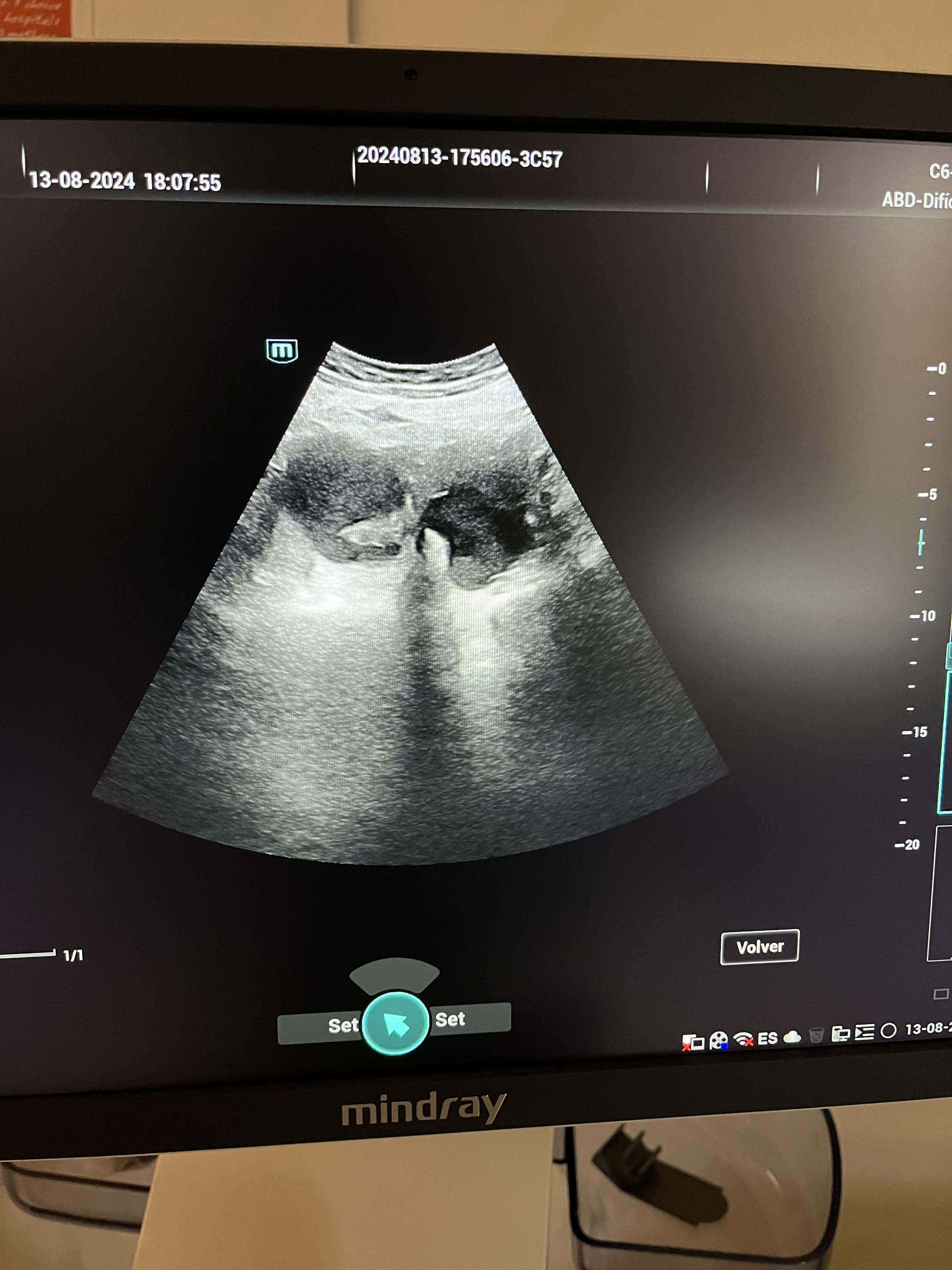Mujer de 44 años con antecedentes de hipotiroidismo, en tratamiento con levotiroxina. Acude en julio de 2024 por dolor en cadera derecha de características inflamatorias, de predominio nocturno. La exploración física inicial fue normal, salvo por dolor a la palpación en la cadera derecha, por lo que se indicaron antiinflamatorios. A las dos semanas, se reevalúa debido a empeoramiento del dolor, con aparición de dolor constante y punzante en la fosa ilíaca derecha (FID), de predominio nocturno y sin respuesta a antiinflamatorios. En la exploración abdominal se palpa una masa en la FID de gran tamaño, por lo que se decide realizar una ecografía a pie de cama.