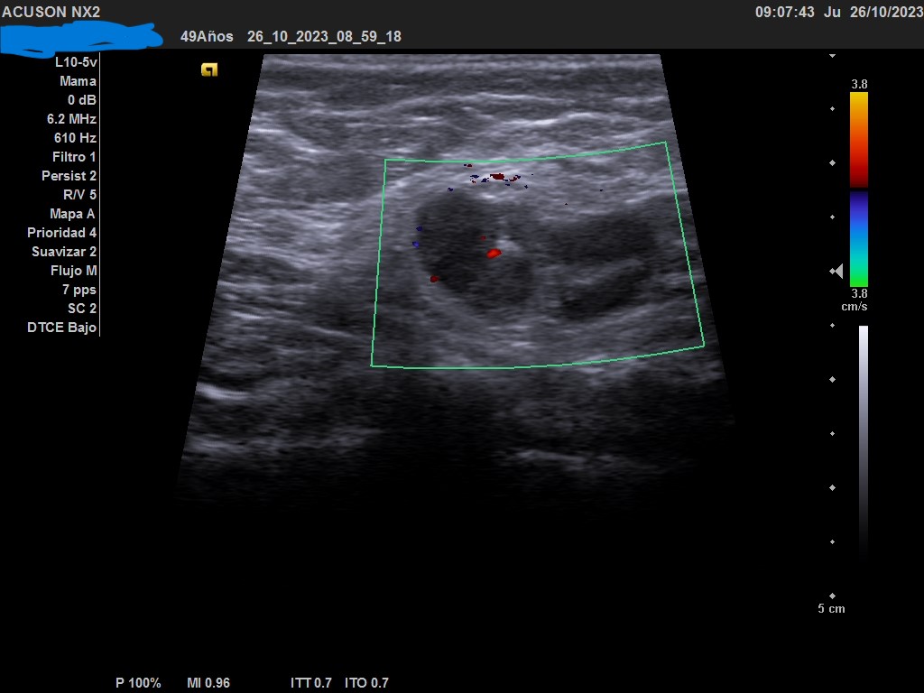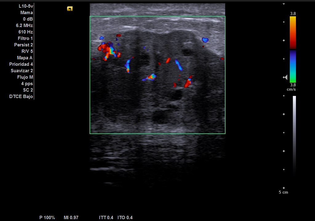 Se realiza ecografía clínica de mama a descartar proceso infeccioso (mastítis) versus masa palpable sospechosa de malignidad.