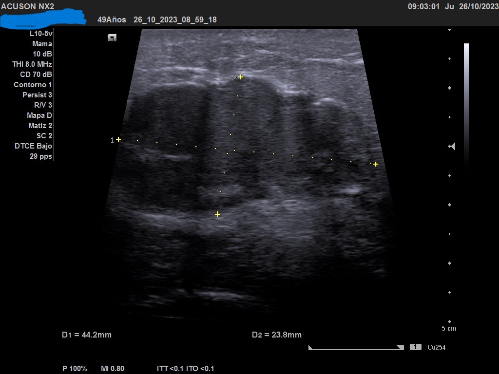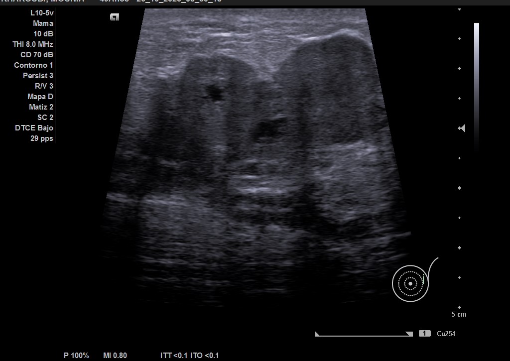 Diagnóstico: Carcinoma infiltrante de mama: la ecografía nos ayudó a terminar de sospechar proceso maligno y hacer diagnóstico diferencial con patología benigna de mama como ser quistes mamarios o mastitis.