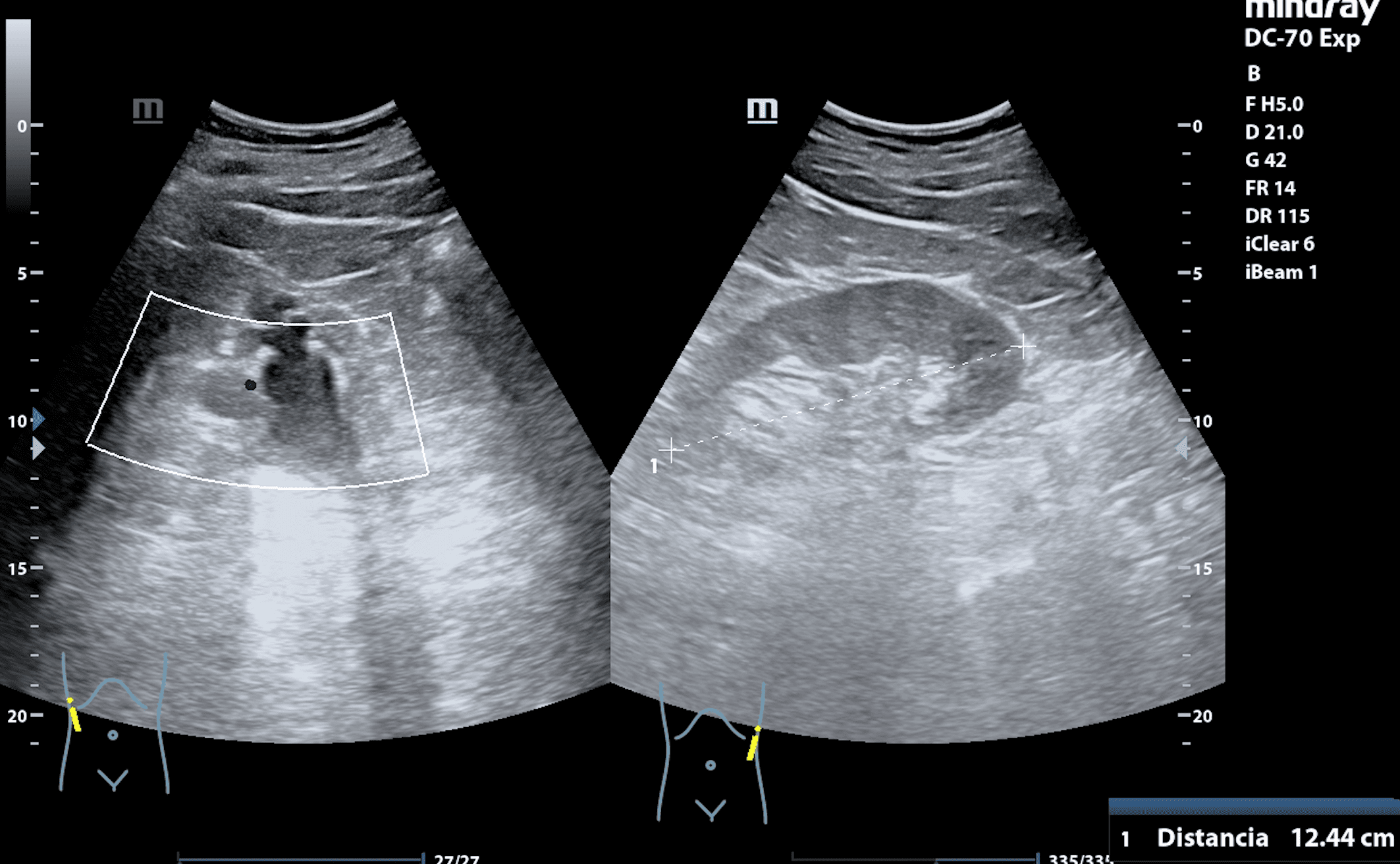 En urgencias se realiza analítica con valores dentro del límite de la normalidad. Se descarta alteración de la función renal. Se confirman los hallazgos mediante ecografía en servicio de urgencias hospitalario.