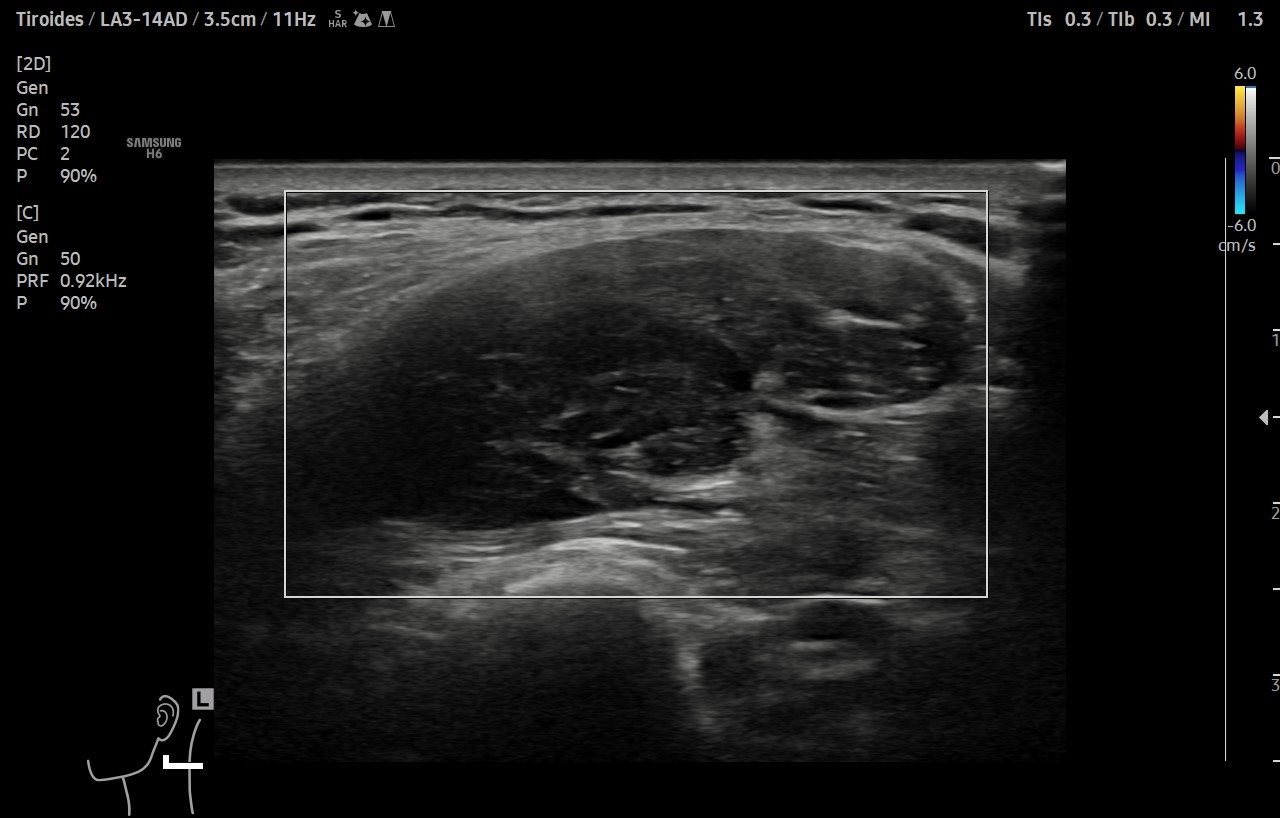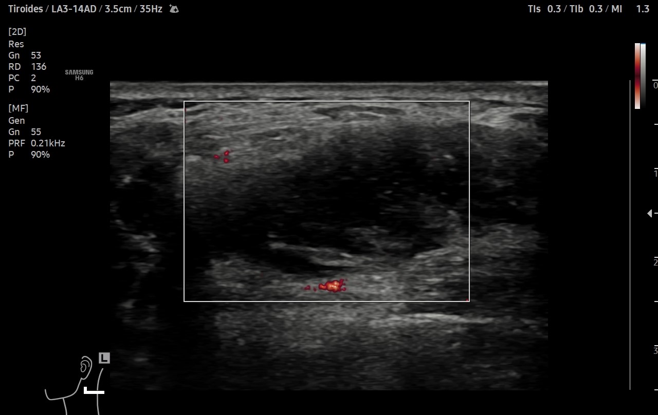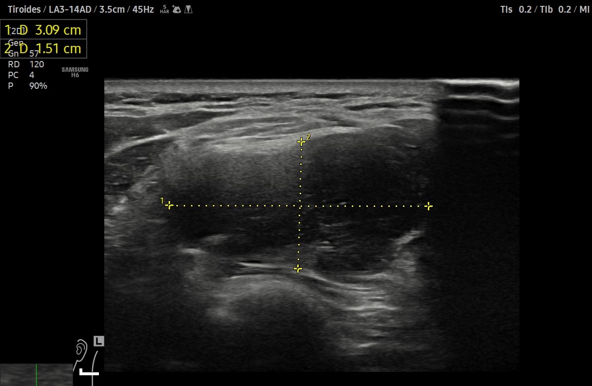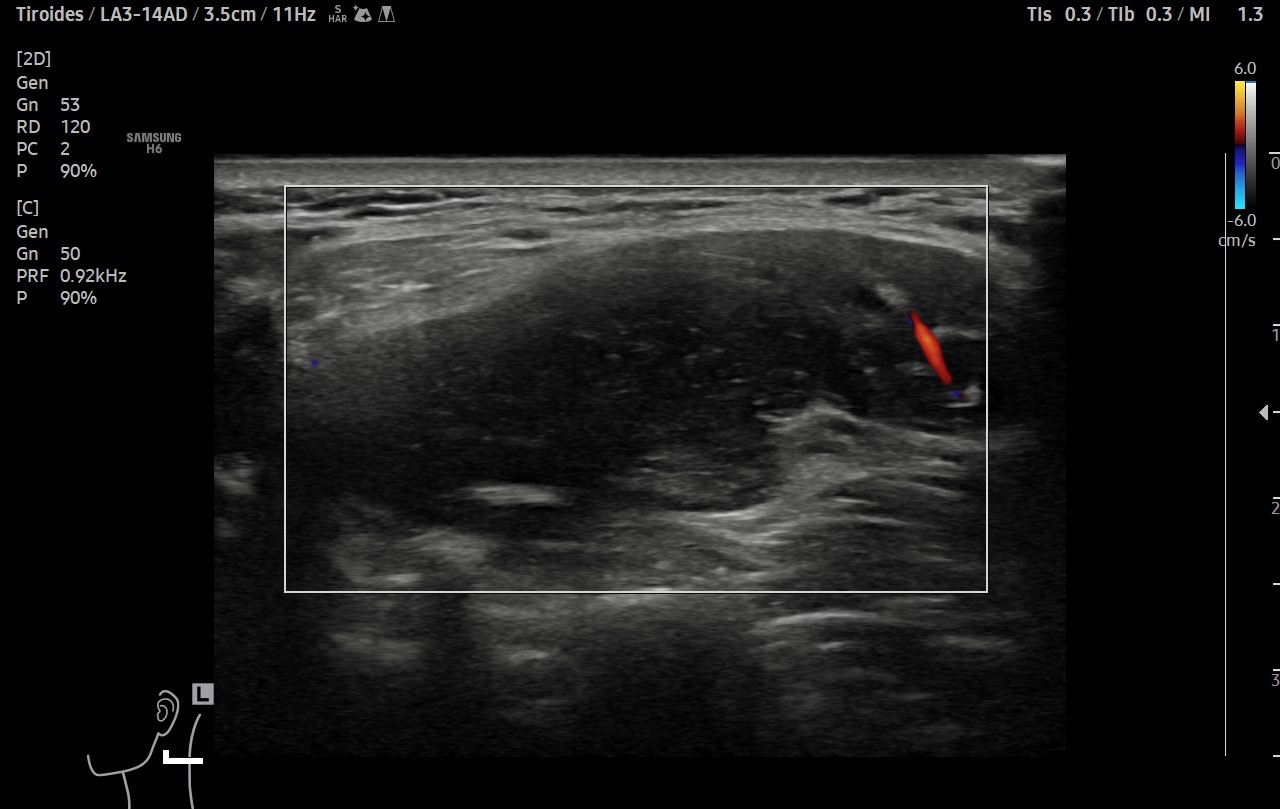 Ecografía clínica de cuello: objetivando en cara lateral izquierda una imagen hipoecogénica, lobulada, heterogénea y vascularizada al Doppler, de aproximadamente de 3 cm, con apariencia de depender de la capa muscular. Adicionalmente, se detectó un nódulo tiroideo izquierdo con microcalcificaciones, aunque la TSH era normal.