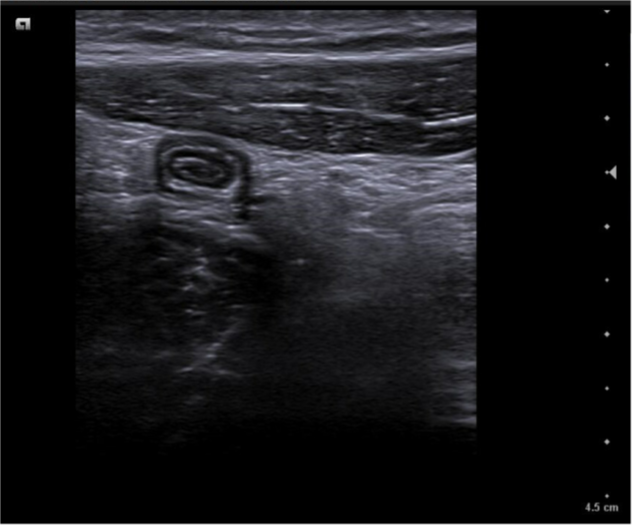 Caso 2. Asa intestinal fija con edema de pared por posible apendicitis o ileitis. Corte transversal con signo del donut.