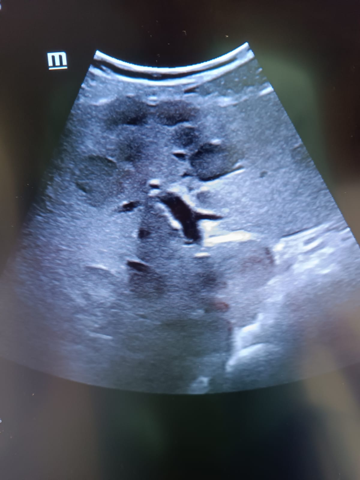 Por sindrome constitucional, hepatomegalia y antecedente de alcoholismo, se decide la realización de ecografía abdominal clínica en consulta. Esta revela múltiples lesiones hepáticas de características ocupantes de espacio, con un patrón irregular sugestivo de metástasis, vias intra y extrahepáticas biliares normales. Este hallazgo refuerza la sospecha clínica de neoplasia avanzada y facilita la derivación a consultas de alta resolución con la priorización de un TAC toracoabdominal preferente.