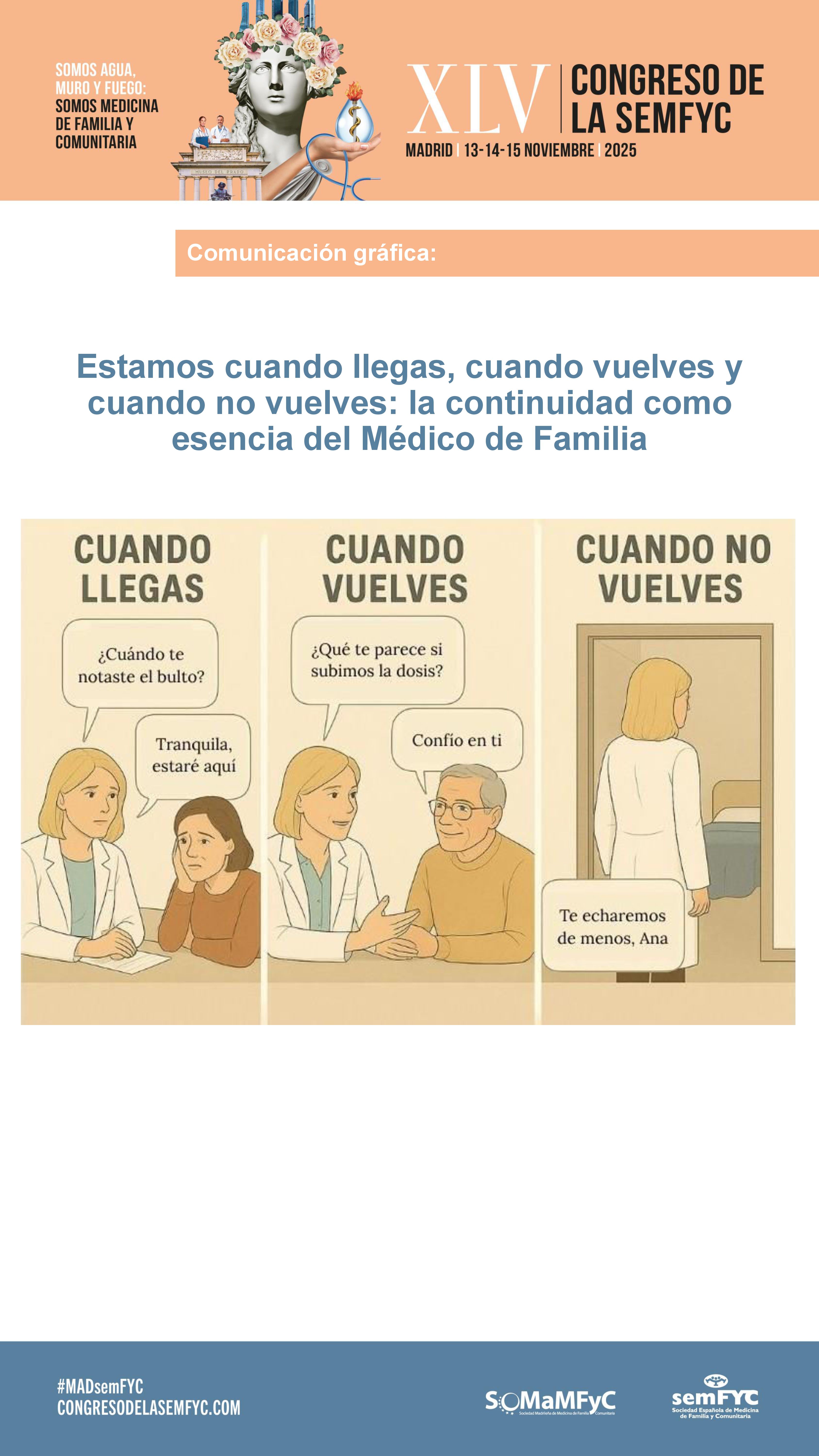 Representar visualmente la continuidad asistencial como núcleo del trabajo del médico de familia, a través de escenas clínicas reales que muestran el acompañamiento a lo largo del tiempo, más allá del episodio aislado.