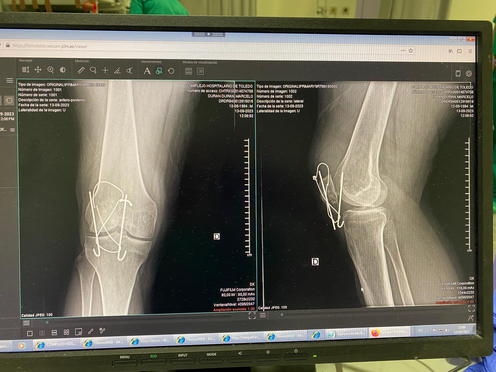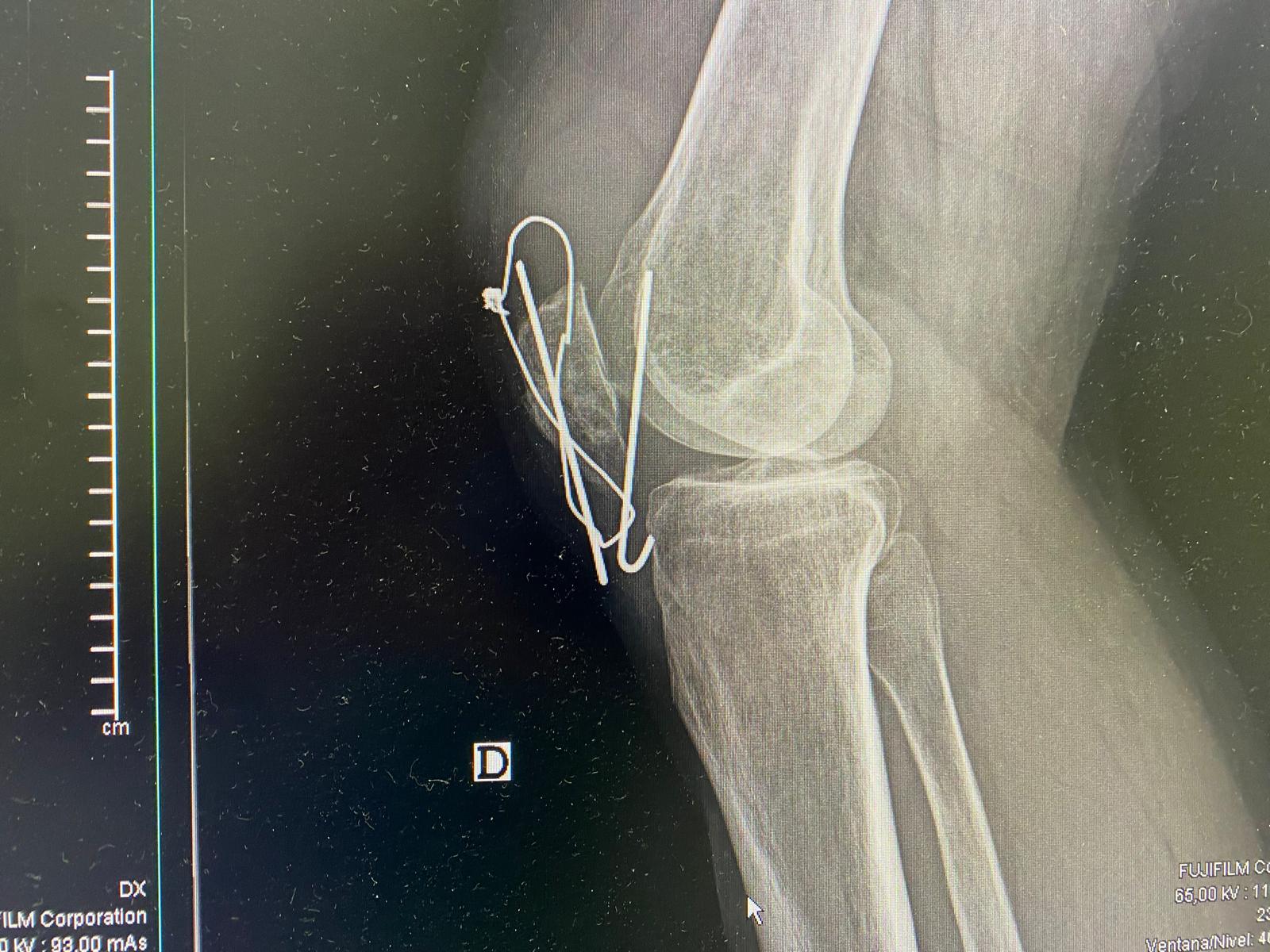 Paciente se cita en AP a los 30 días de la extracción de material de osteosíntesis, en la exploración física se objetiva herida quirúrgica limpia sin signos de infección, movilidad activa y pasiva de la rodilla recuperada totalmente con algún grado de dolor EVA 3/10 a últimos grados de movimientos en flexo-extensión, no signos de flogosis ni complicaciones postoperatorias inmediatas ni mediatas durante su estancia hospitalaria.