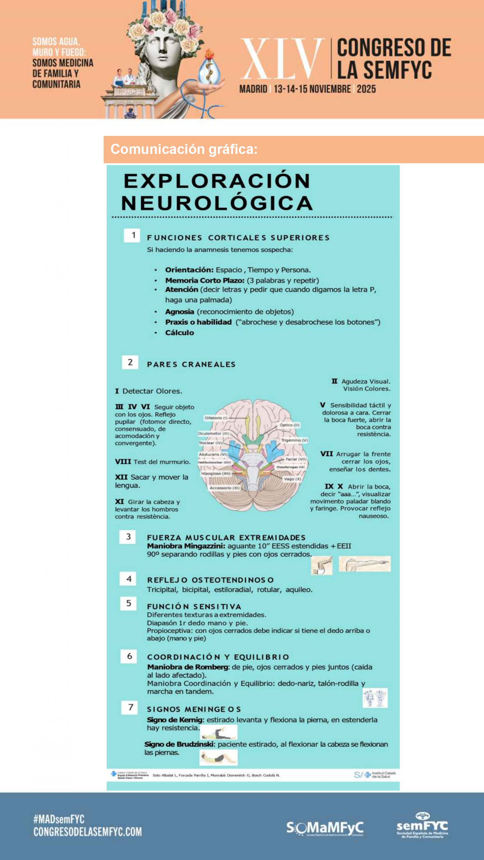 Funciones Corticales Superiores: Incluye la evaluación de orientación (espacio, tiempo y persona), memoria, atención, agnosia, praxia y cálculo.