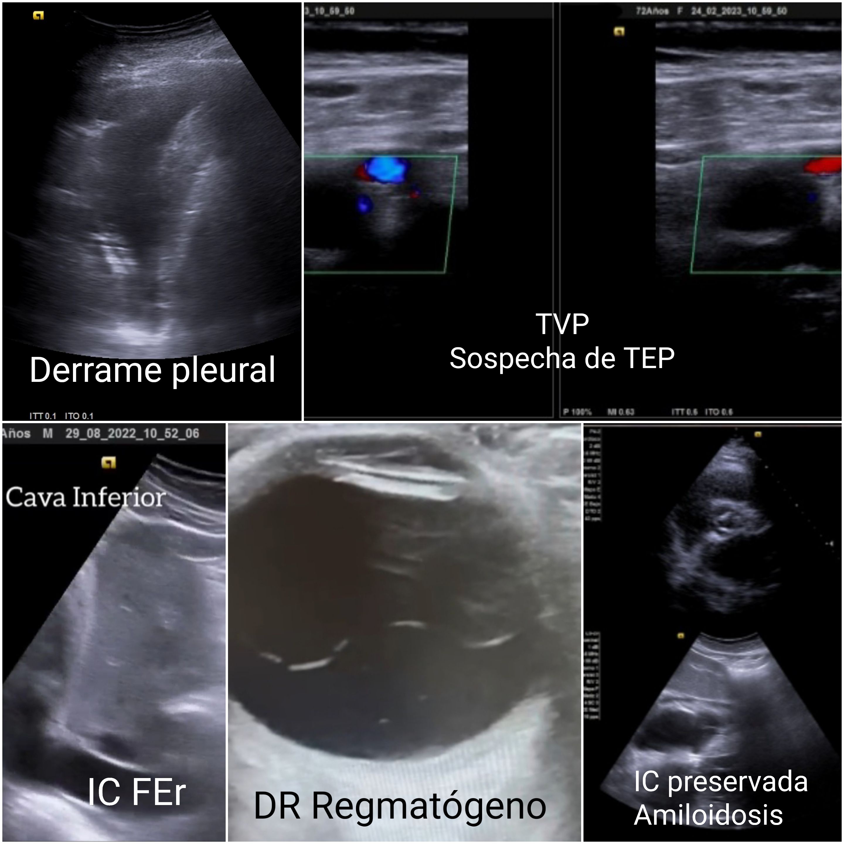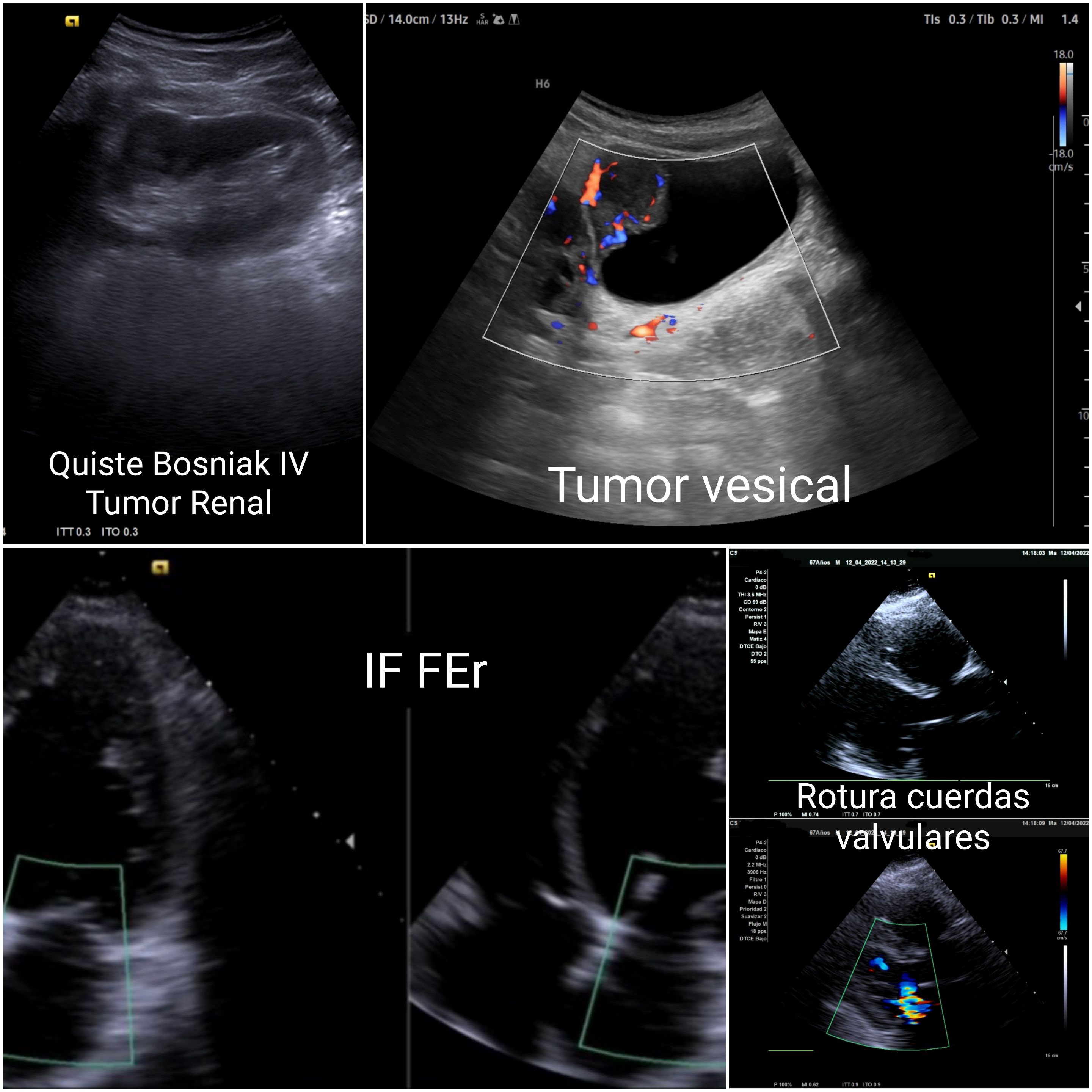 Se presentan 12–15 casos ilustrativos: (1) rotura de cuerdas mitrales recuperada desde lista de espera (ecocardioscopia); (2) postcirugía cardíaca dado de alta con derrame y congestión no detectados; (3) insuficiencia cardíaca (IC) tras pancreatitis con derrame pleural; (4) IC dada de alta pendiente de ecocardiografía, en AP se confirma FE reducida; (5) Trombosis venosa (TV) con disnea sin sin angio-TC; (6) ELA: fasciculaciones por ecografía con alta demora para neurología; (7) desprendimiento de retina reenviado dos veces a urgencias Hospital; (8) aumento del diámetro de la vaina del nervio óptico con sospecha de patología de nervio óptico; (9) lesión de Hill-Sachs no detectada en hospital; (10) lesión renal Bosniak IV (carcinoma renal); (11) tumor vesical de pared tras ecografía hospitalaria previa normal; (12) angioleiomioma etiquetado como quiste epidérmico.