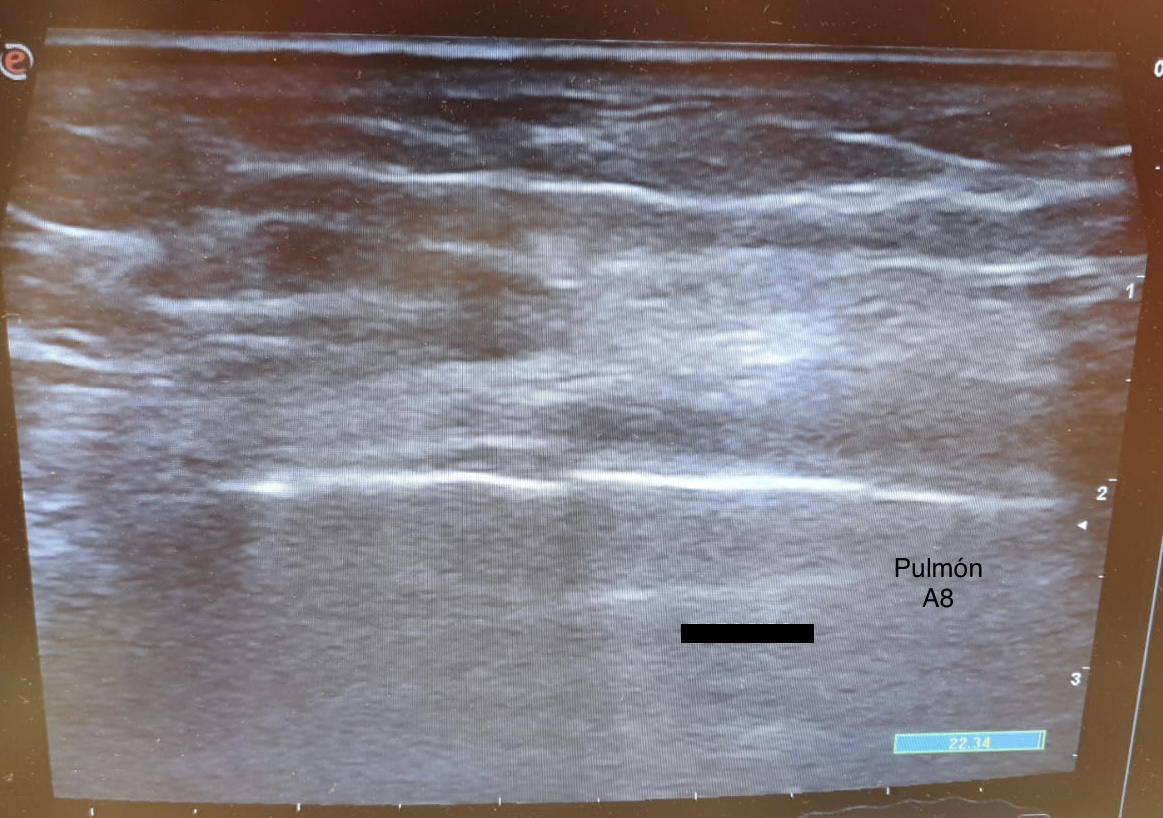 El examen eFast muestra sliding presente con línea pleural irregular y líneas B en la zona del traumatismo. Resto de zonas del examen negativas. La ecografía costal muestra imágen disrupción de la cara anterior de la cortical ósea de la séptima costilla compatible con una fractura costal.