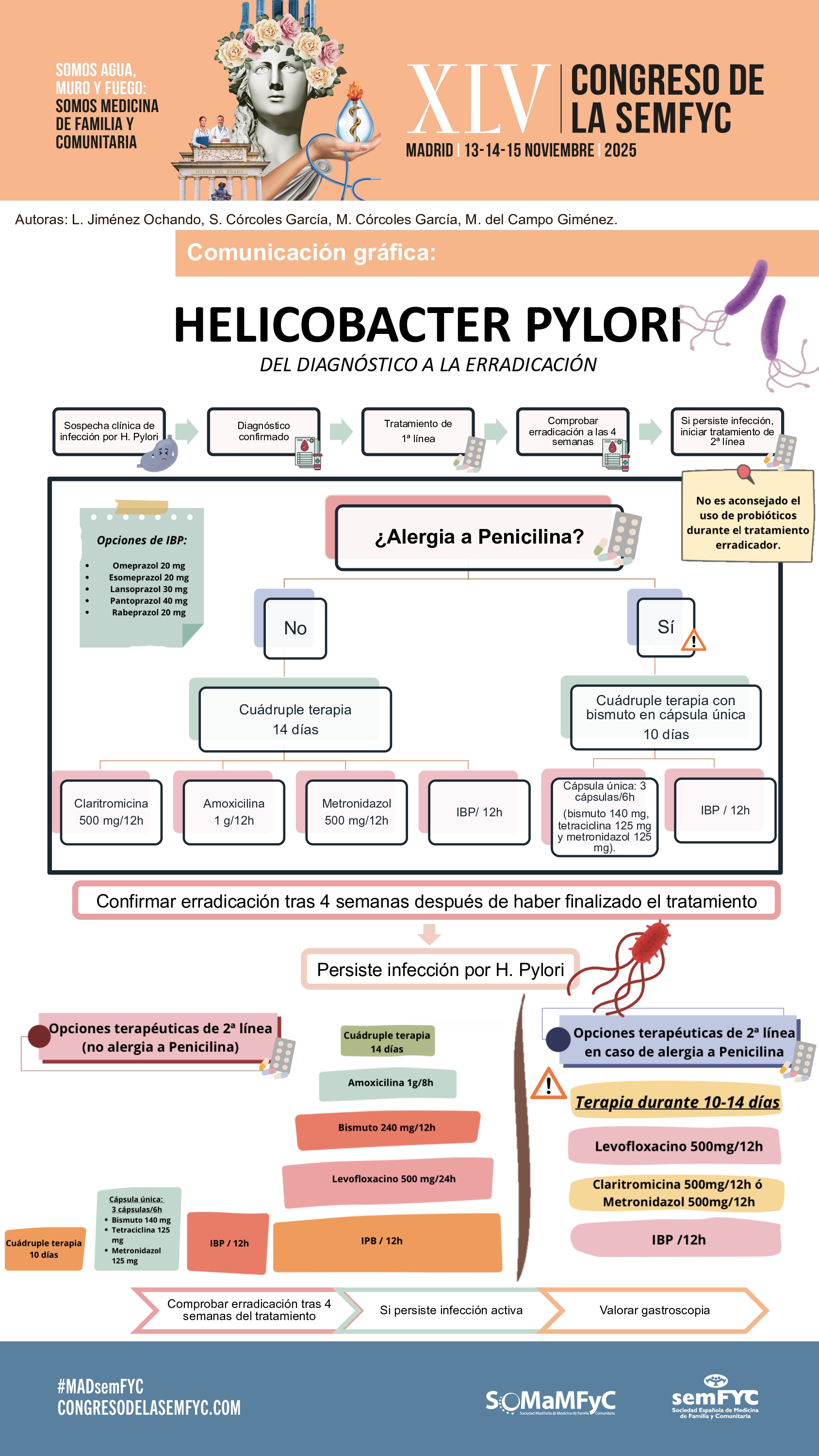 El objetivo de la presente infografía es sintetizar el abordaje diagnóstico y terapéutico de la infección por Helicobacter pylori en las consultas de medicina de familia, ofreciendo un soporte visual que facilite la aplicación de las recomendaciones basadas en la evidencia y fomente la homogeneización de la práctica asistencial.