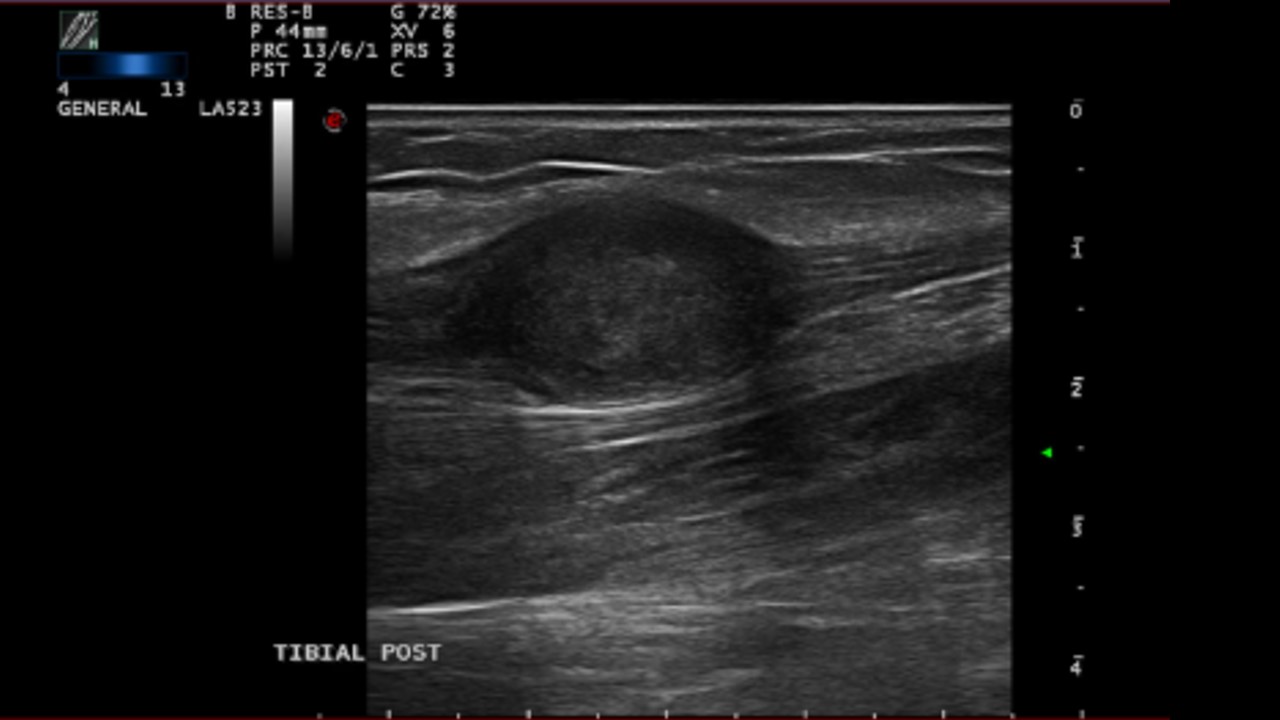 Ecografía reglada: tumoración de aproximadamente 2,4 cm. Impresión diagnóstica: Neurilemoma dependiente del nervio tibial posterior.