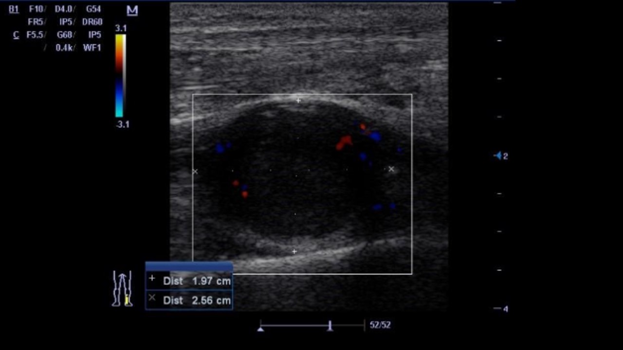 2018 Ecoscopia de atención primaria: imagen hipoecogénica de 2,5 x 2 cm redondeada por debajo de arteria tibial posterior con imagen Doppler periférica. Impresión diagnóstica: hematoma local. Plan: ecoscopia de control.