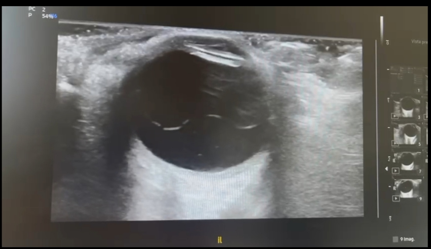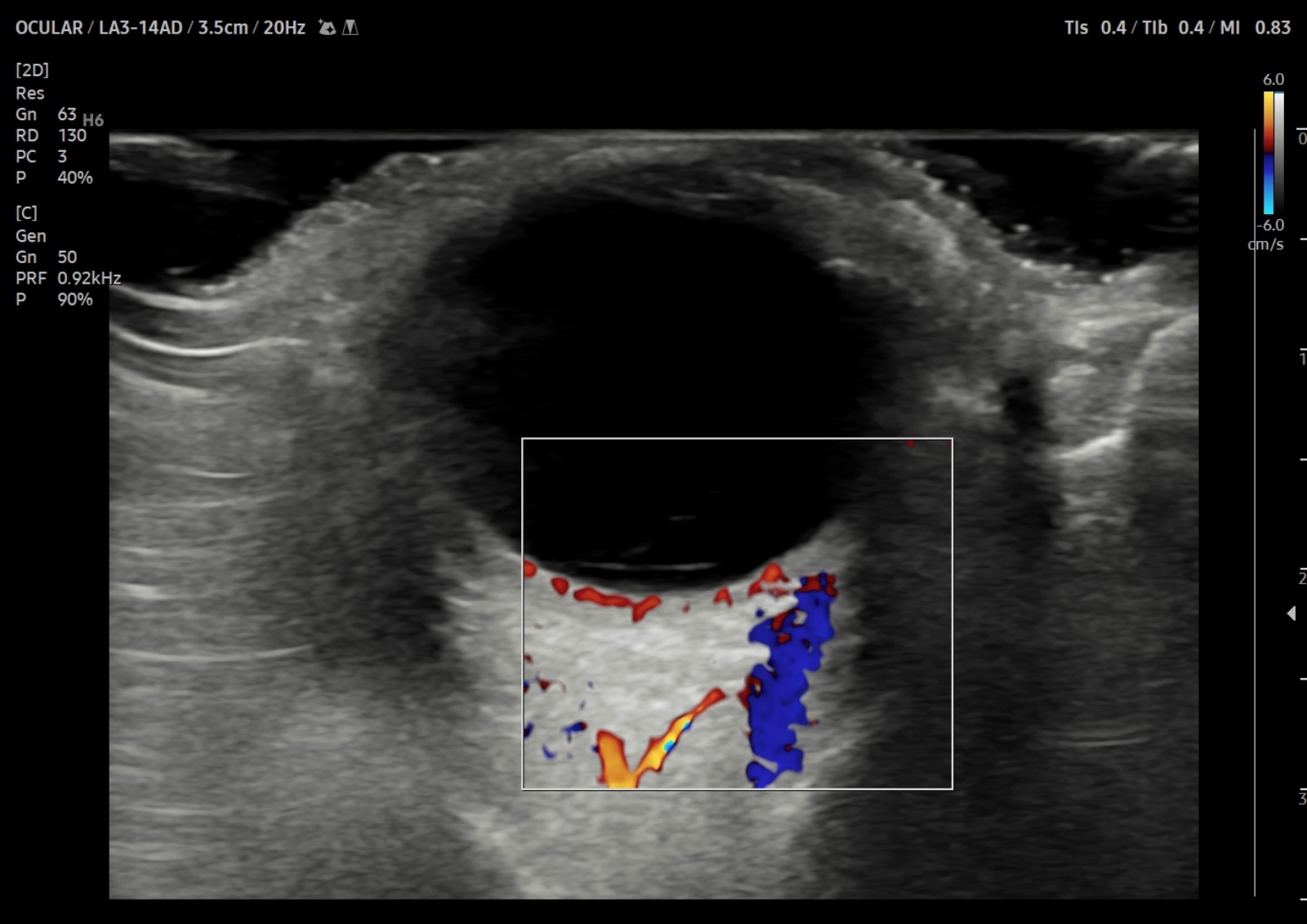 La ecografía ocular clínica en consulta, sonda lineal apoyando la sonda sin presionar, ojo cerrado, abundante gel, reducción de la potencia manteniendo atención al índice térmico y mecánico. Mostró una lámina hiperecogénica móvil en polo posterior, no originada en el nervio óptico (cuya distancia de vaina del nervio óptico menor de 5 mm), con bamboleo marcado a la maniobra dinámica (signo de la 'lavadora') y abundantes ecos móviles difusos en vítreo (aportaré video de maniobra dinámica).
