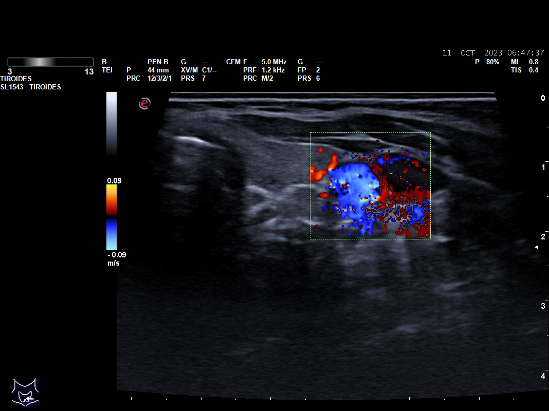 Hallazgos ecográficos: nódulos tiroideos subcentimétricos sin cambios, yugular interna izda con contenido discretamente hiperecogénico que no capta Doppler y colapsabilidad incompleta.