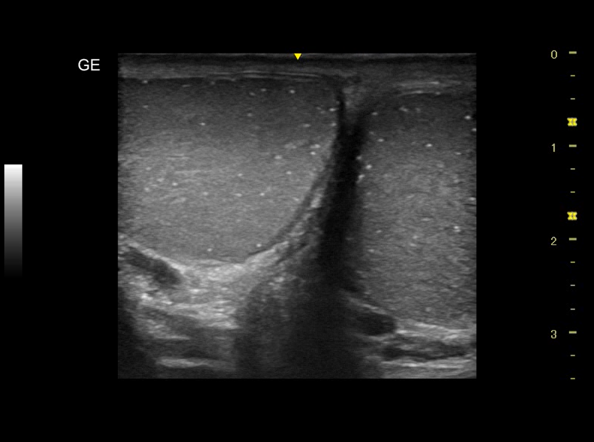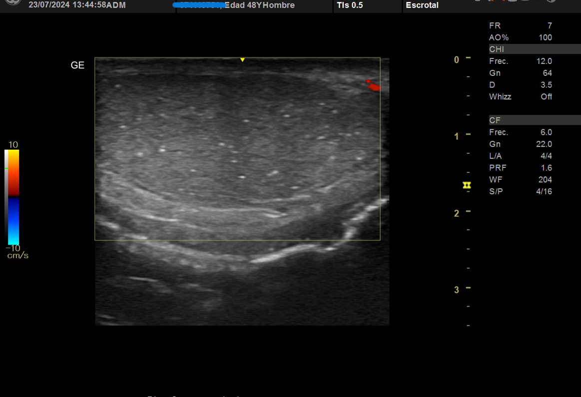 Realizamos ecografía clínica testicular: observamos ambos testículos con microlitiasis bilaterales puntiforme sin sombras acústicasen, en forma de cielo estrellado, vascularización normal, cabeza epidídimo izquierdo con leves signos inflamatorios, mínimo hidrocele.